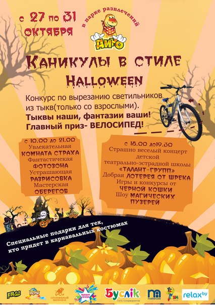 Пришедших на праздник гостей ожидает масса приключений: увлекательная комната страха, фантастическая фотозона; устрашающая разрисовка и мастерская оберегов. Детишек ждут: добрая лотерея от Шрека, игры и конкурсы от Черной Кошки, шоу мыльных пузырей и специальные подарки для тех, кто придет в карнавальных костюмах. А за первое место в конкурсе по вырезанию светильников из тыкв выигрыш - велосипед!