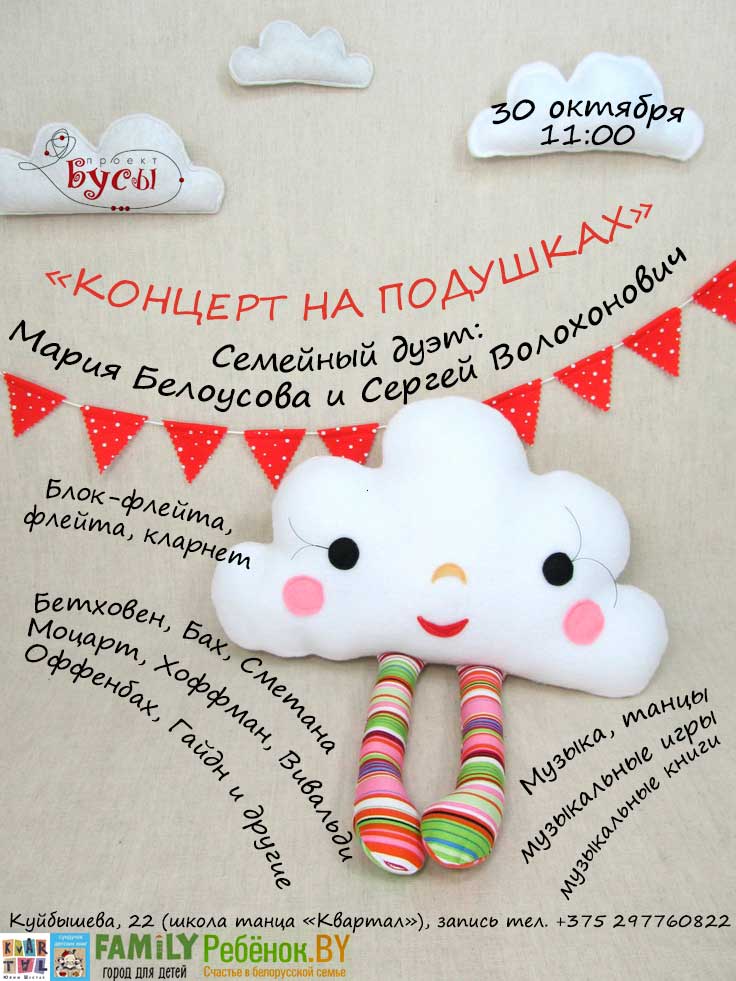 Посетителей нового проекта от «Бус» ждет классическая музыка в исполнении семейного дуэта: Марии Белоусовой (блок-флейта, флейта) и Сергея Волохоновича (блок-флейта, кларнет). Ребята получат возможность не только послушать красивую музыку, но и потанцевать, порисовать, полепить, поиграть в музыкальные игры, полежать на коленках родителей и бережно прикоснуться к инструментам музыкантов.