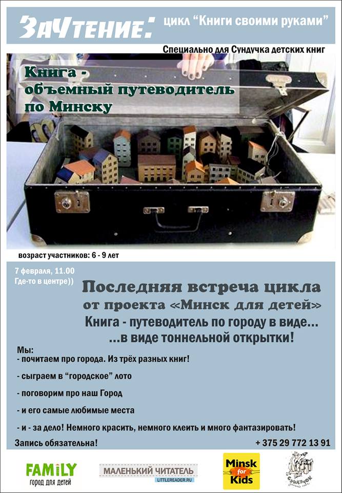 Дополнительная и последняя встреча в рамках проекта «Книги своими руками» пройдет 7 февраля. На этот раз приглашенный мастер – Наталья Селецкая, руководитель проекта «Минск для детей». Она многое знает о Городе. И детском, и книжном. И готова рассказать об этом детям.