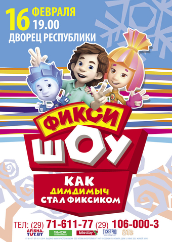 Дворец Республики приглашает детей посмотреть на обновленную программу фиксиков в детском представлении «Фикси-шоу». Зрители увидят новые декорации, музыкальные игры, фиксипелки и главного героя шоу ДимДимыча.