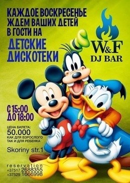 Каждое воскресенье, с 15.00 до 18.00, на втором этаже ресторана проводятся детские дискотеки. Для маленьких гостей работают лучшие ди-джеи, веселый клоун, аниматоры. Детей ждем веселая программа, зажигательные танцы, конкурсы и развлечения.