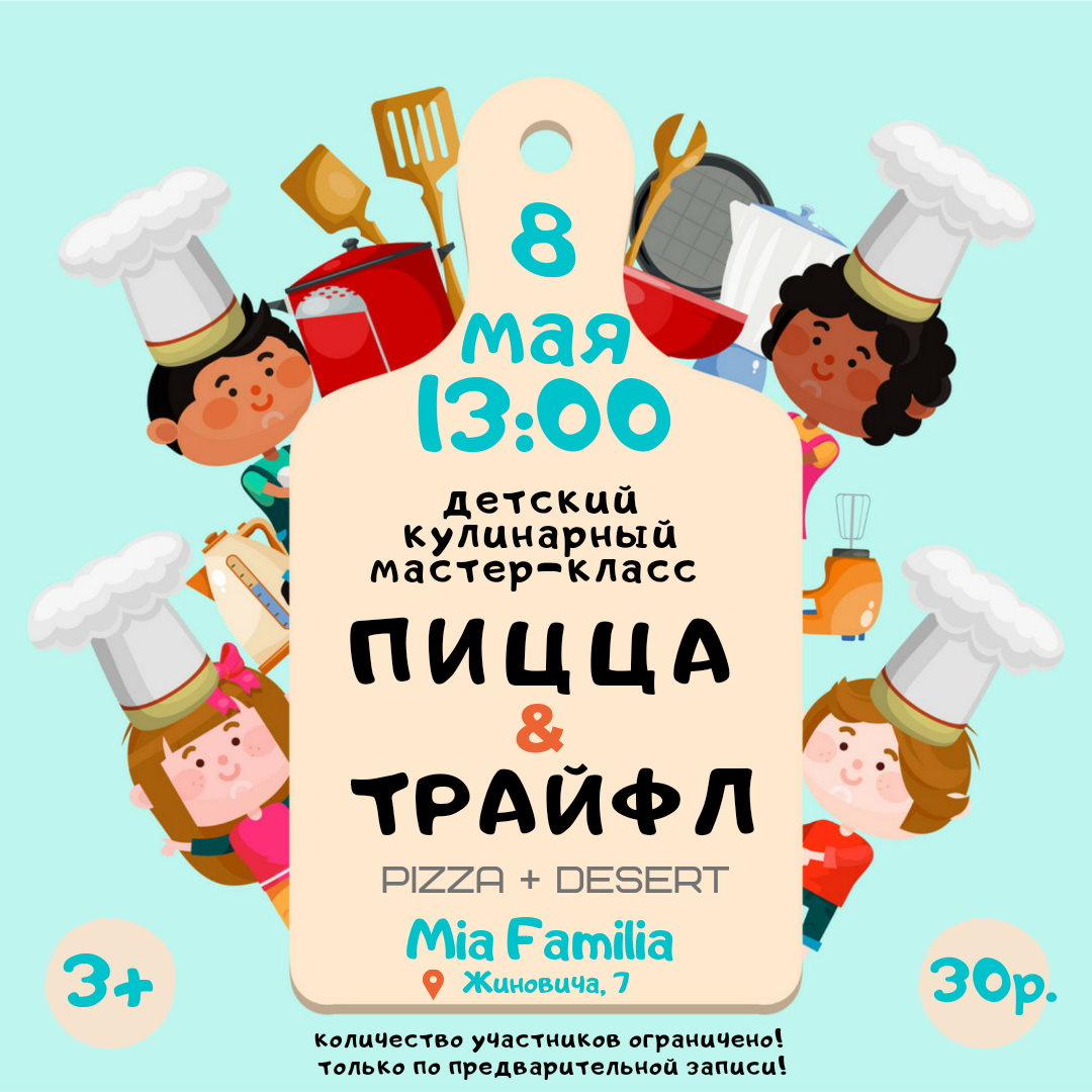 Начинайте большие выходные с семейными кафе "Mia Фaмiлiа". 8 мая в 13:00 приглашают на детский кулинарный мастер-класс "ПИЦЦА & ТРАЙФЛ". Приготовят сразу два блюда! Вкуснейшую пиццу и нежнейший десерт!