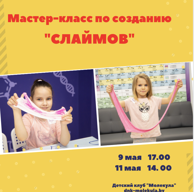 Слаймы и лизуны находятся на пике популярности у современных детей. Они смотрят ролики на ютубе и расходуют мамин крем. Детский научный клуб «Молекула» приглашает ребят от 5 до 12 лет на мастер-класс по созданию слаймов. Выбрать свой цвет, а возможно смешать несколько, выбрать аромат, блестки, шарики. Процесс творчества, увлекающий ребят всех возрастов.