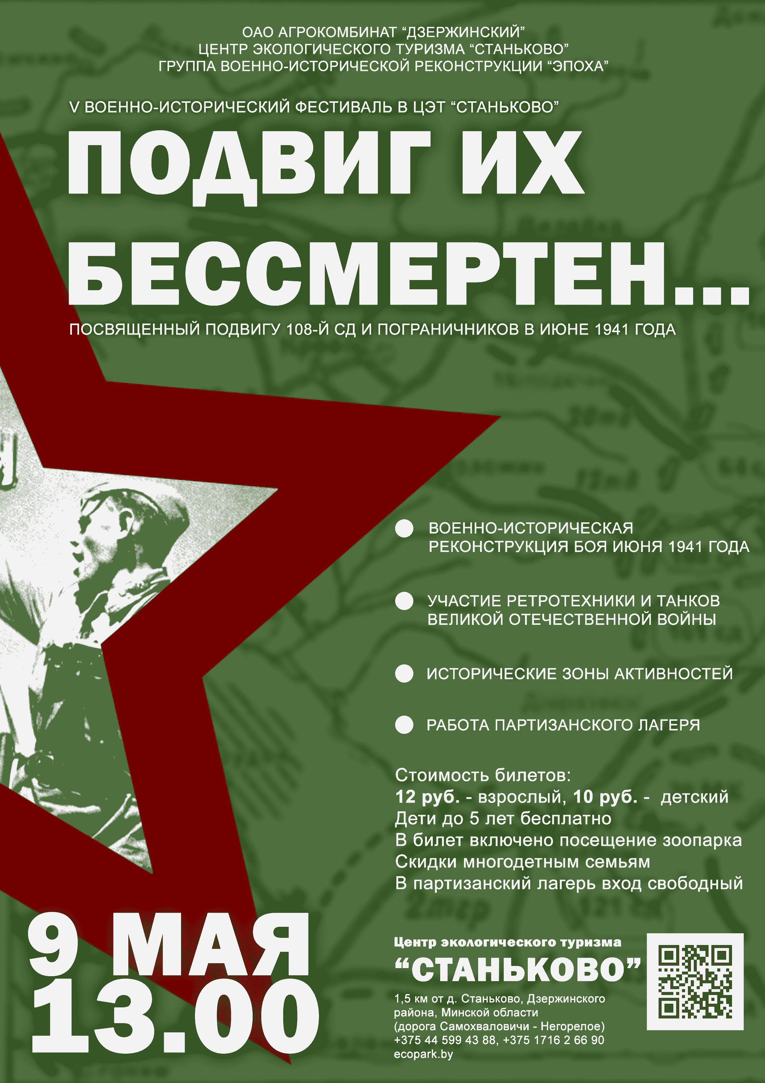 9 мая 2021 года в 13.00 Центр экологического туризма «Станьково» приглашает на военно-историческую реконструкцию с участием ретротехники и танков. Также Вас ждет антураж солдатского быта Великой Отечественной войны, исторические зоны активностей и стрельба из охолощенного оружия в Партизанском лагере, солдатская каша, комплекс развлечений для детей и взрослых, зоосад и многое другое.