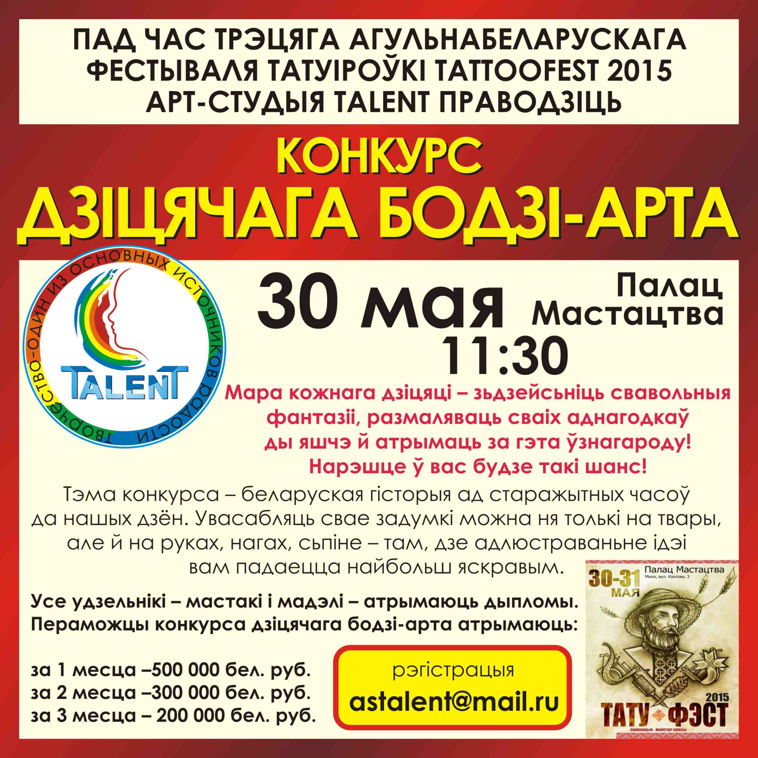 Рады паведаміць, што пад час трэцяга агульнабеларускага фестываля татуіроўкі TATTOOFEST 2015, які будзе ладзіцца 30-31 мая ў мінскім Палацы Мастацтва (вул. Казлова, 3), Арт-студыя TALENT праводзіць Конкурс дзiцячага бодзi-арта!