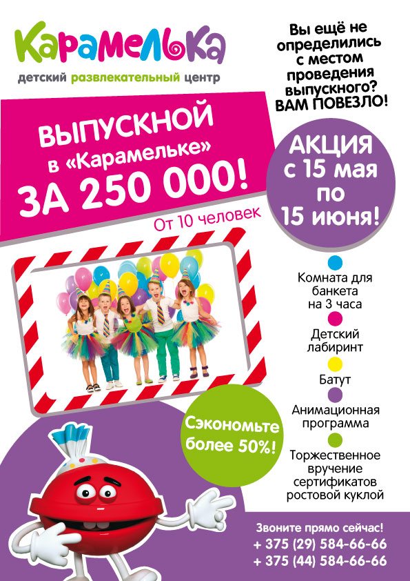 Только с 15 мая по 15 июня улетный выпускной в КАРАМЕЛЬКЕ с супер скидкой: всего за 250 000 рублей!