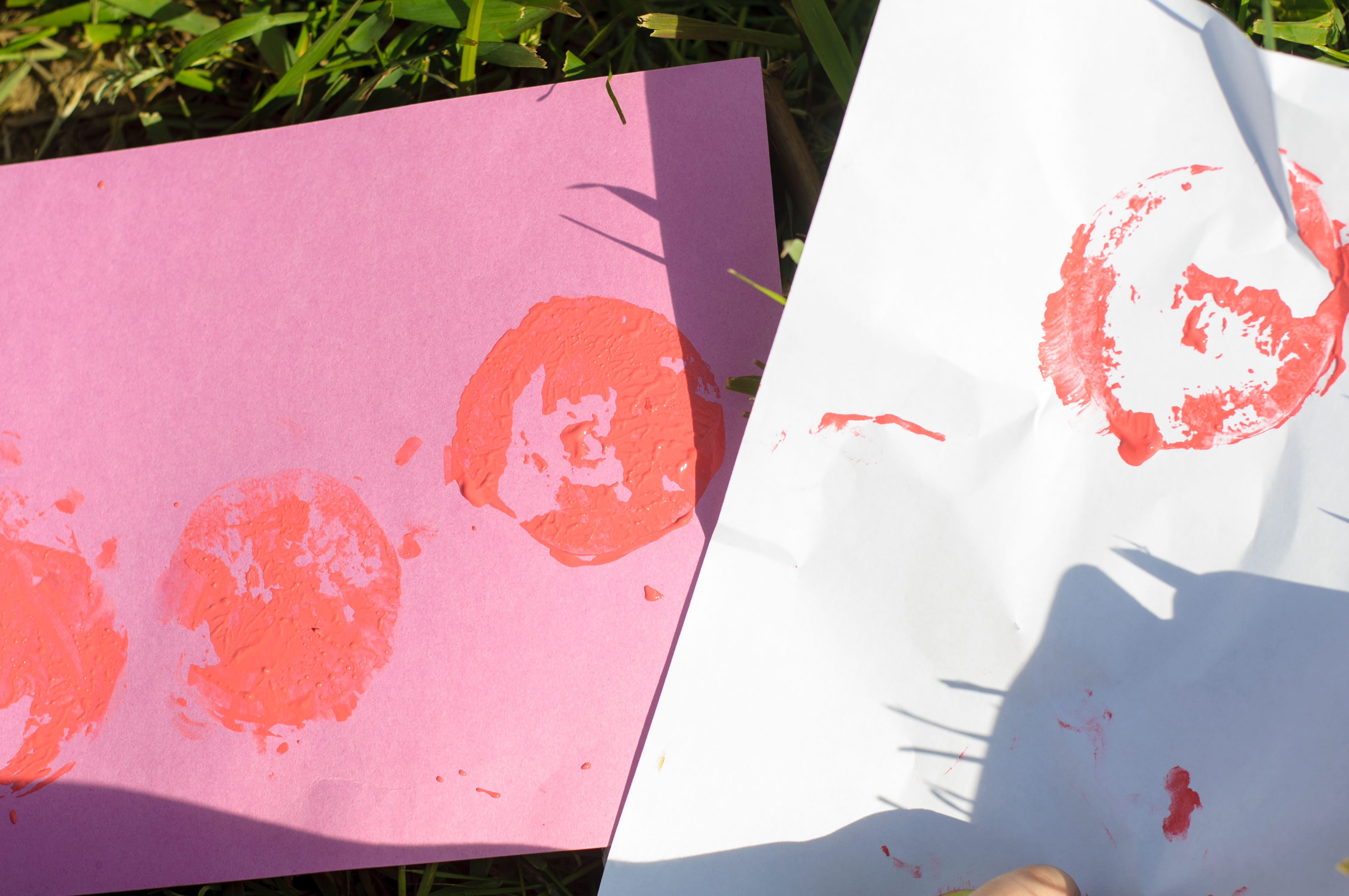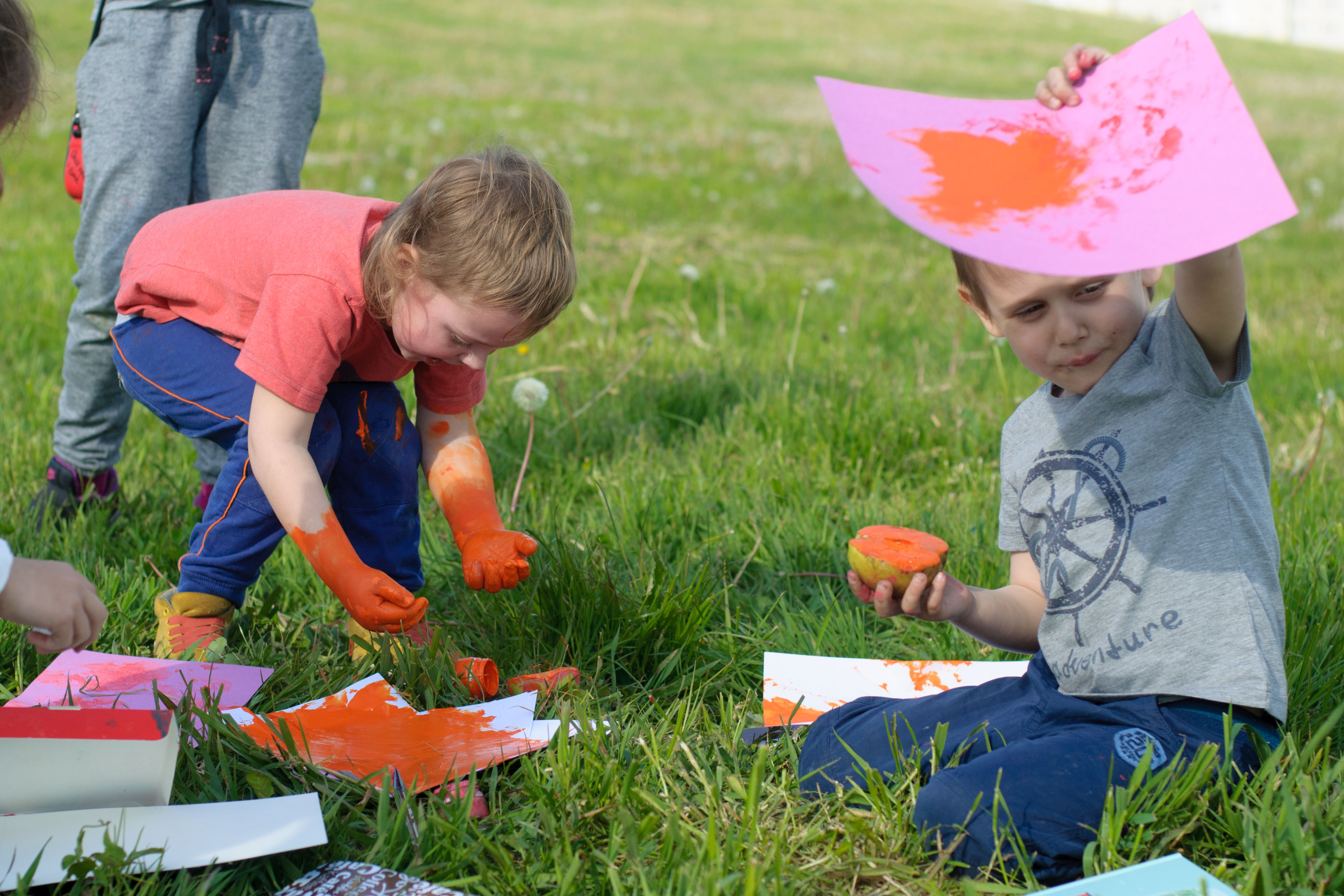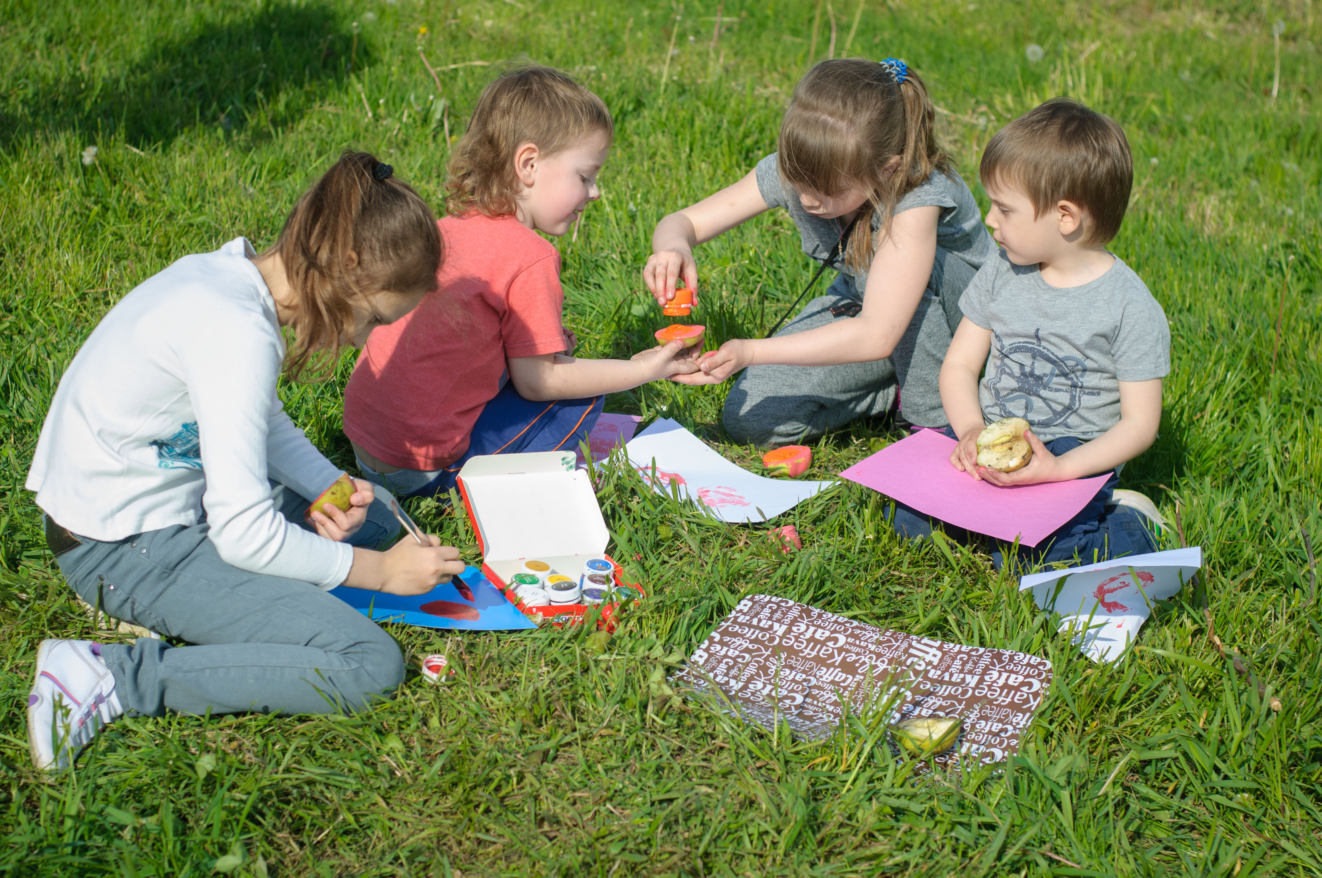 А после вкусного обеда… можно и порисовать. И снова яблоки, а точнее, штампы яблоками на разноцветной бумаге - отличный способ изучить свойства цвета. Перед родителями была задача показать, могут ли разные цвета выглядеть одинакова. И у нас получилось. Оказывается, разные цвета могут выглядеть одинаково, если их поместить на контрастные фоны. Нашим творцам понравилось – их невозможно было оторвать от процесса, а некоторых потом и отмыть. Идею порисовать на природе нам подсказала книга «Школа искусств». Это обучающая книга для художников от 8 до 12 лет. Главная цель книги – научить ребенка замечать прекрасное вокруг и умело передать это в своем творчестве. Нашим экспериментаторам всего 4,5 года, но они идею восприняли на ура.