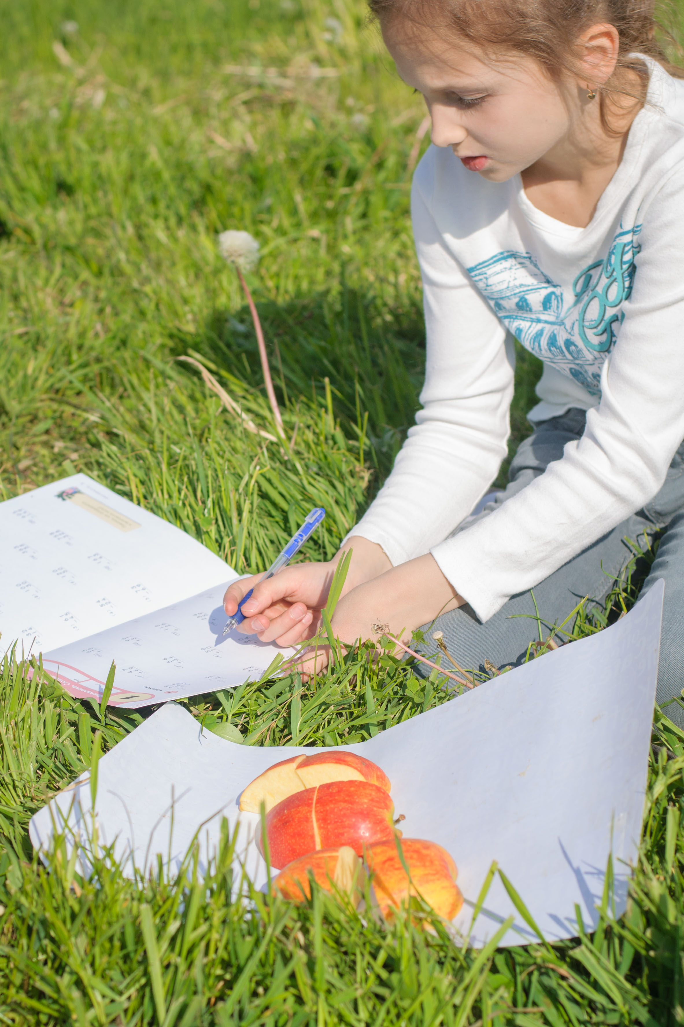 Яблоко легко делится на ½, 1/4, 1/8… С уже разрезанными дольками можно поиграть, складывая их, разделяя, высчитывая, сколько долек в целом яблоке – полет фантазии только приветствуется. У нас игра получилась настолько увлекательной, что Полина, ученица 3-го класса, не теряя времени, решила все задачки первой страницы за несколько минут.