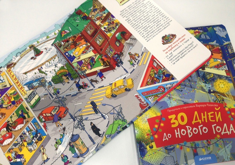 Эта книга словно машина времени сможет перенести вашего ребенка на разные улицы города, заглядывать в разные дни, часы и дома, наблюдать, как по-разному семьи готовятся к празднику. В ней вы найдете удивительные истории. Каждый разворот — это большая иллюстрация и страница календаря с небольшими заданиями по ней, охватываются промежутки по пять дней. Всего в книге 10 разворотов.