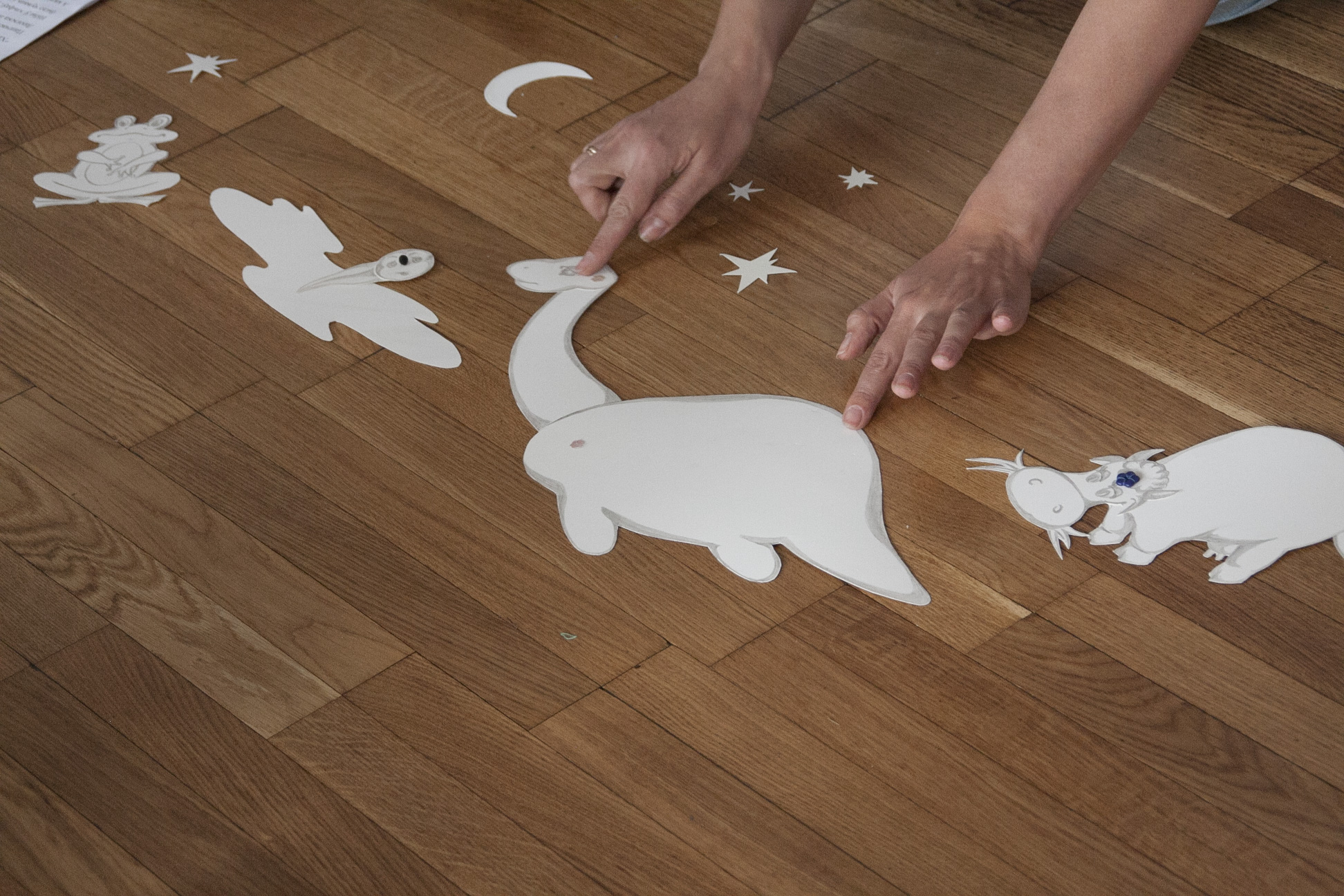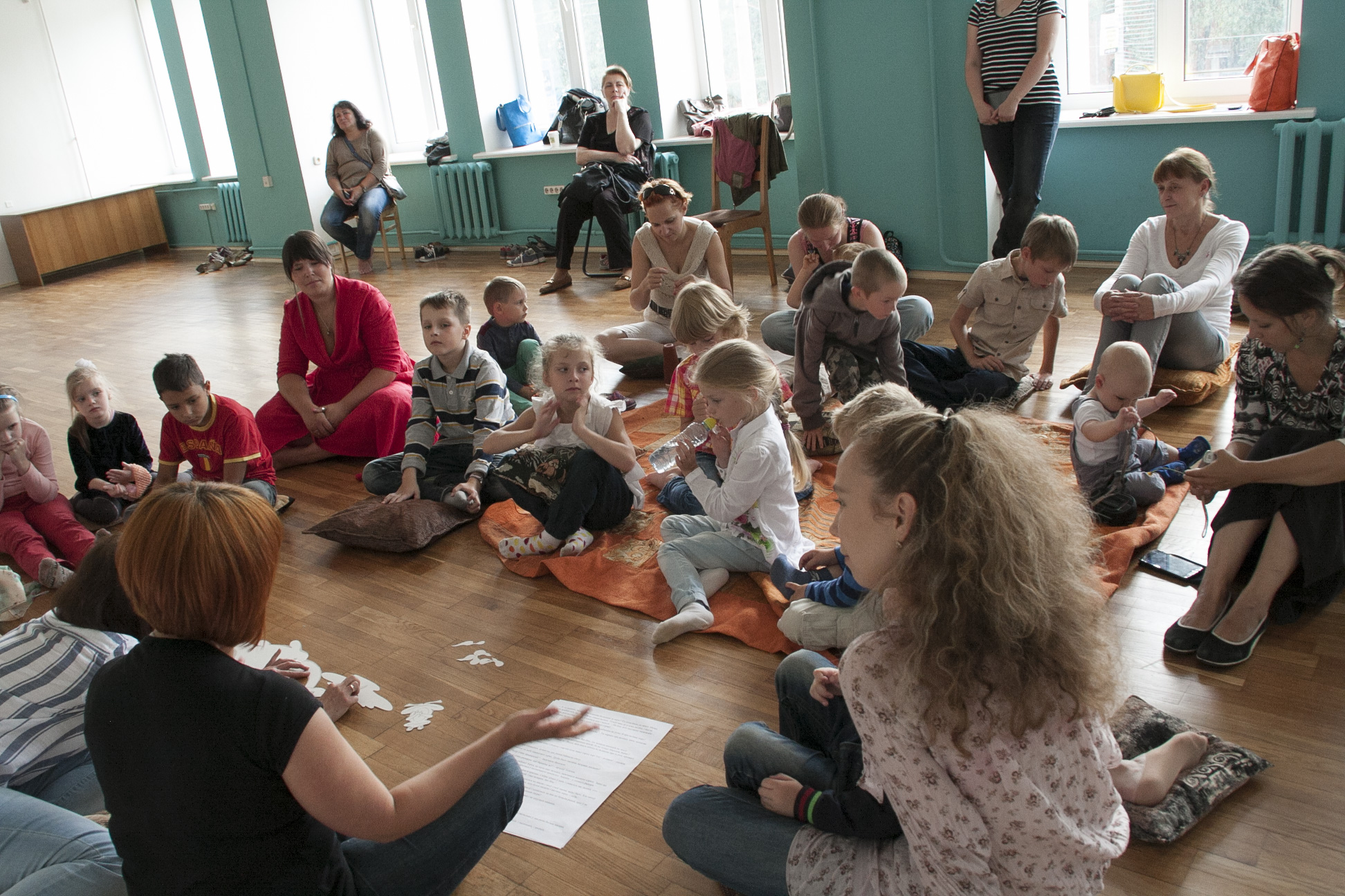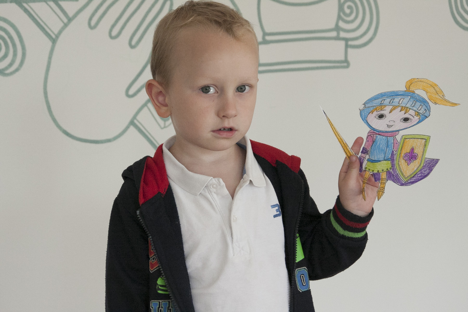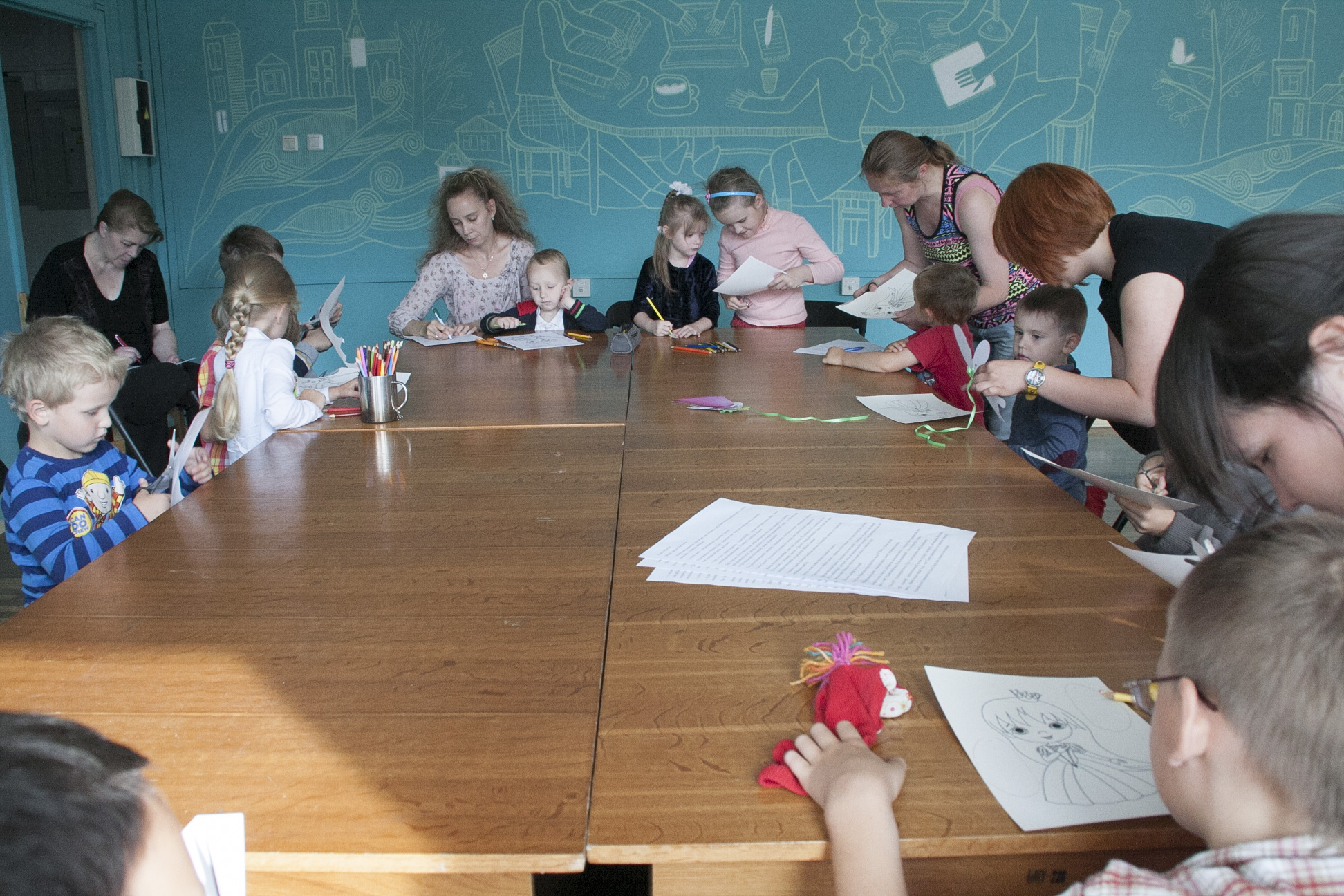 После прочтения сказки детям было предложено поучаствовать в мастер-классе по созданию принцессы и рыцаря. Пока дети вырезали, рисовали и создавали кукол-дергунчиков, родители заполняли оценочные анкеты. Некоторых мам процесс так увлек, что они мечтательно лежали на полу, как на летней лужайке под деревом.