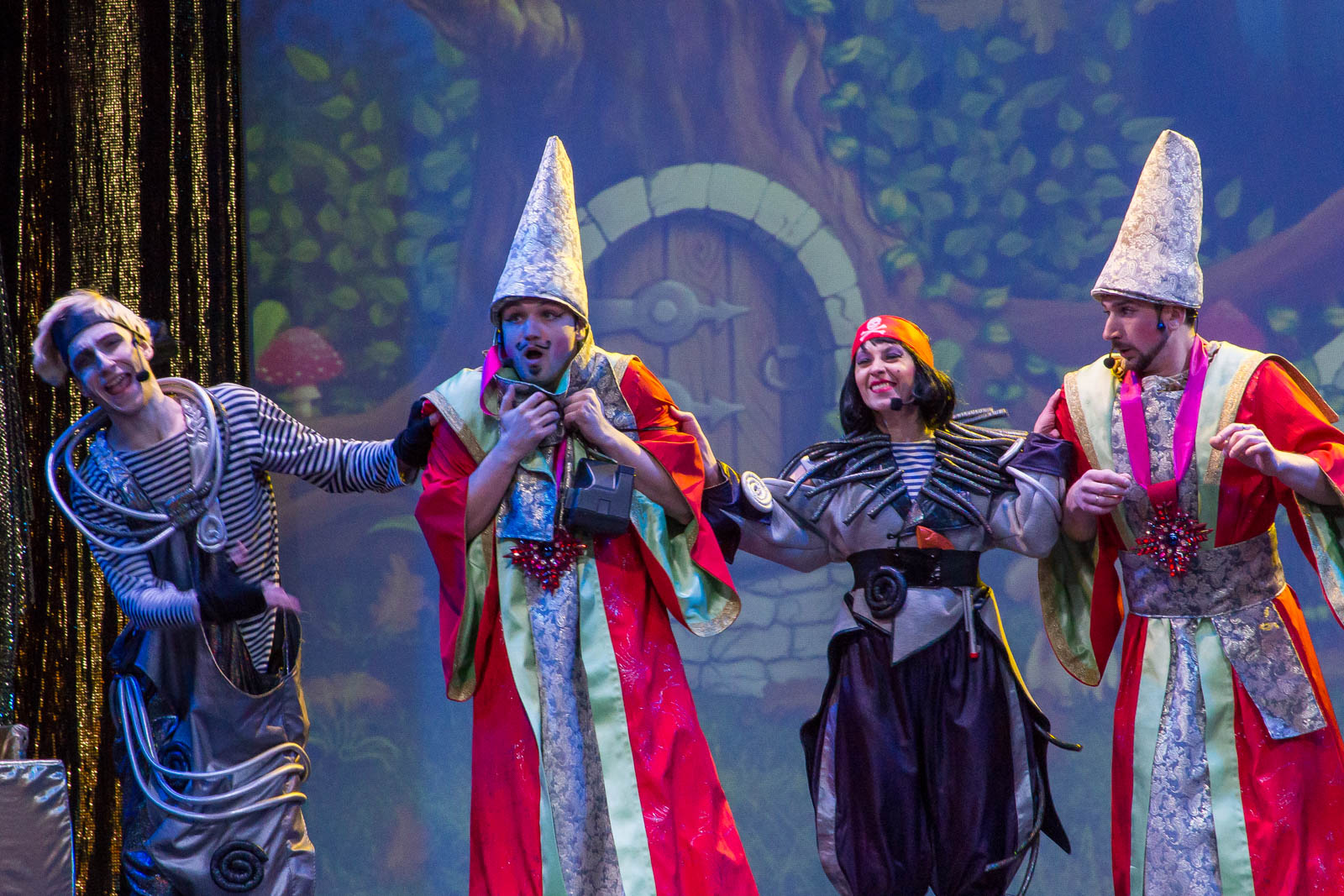 Во время спектакля актеры постоянно находятся в контакте с маленькими зрителями: разбойники и послы разгуливают по залу, здороваясь с малышами, Фея спрашивает совета, какого врача лучше вызвать для Принца, ведь после ее волшебства уши непослушного юноши стали напоминать ослиные. Дружным коллективом будет решено позвать и доктора, и ветеринара. Но даже они не смогут помочь Принцу, так как сами запутаются, кто есть кто.