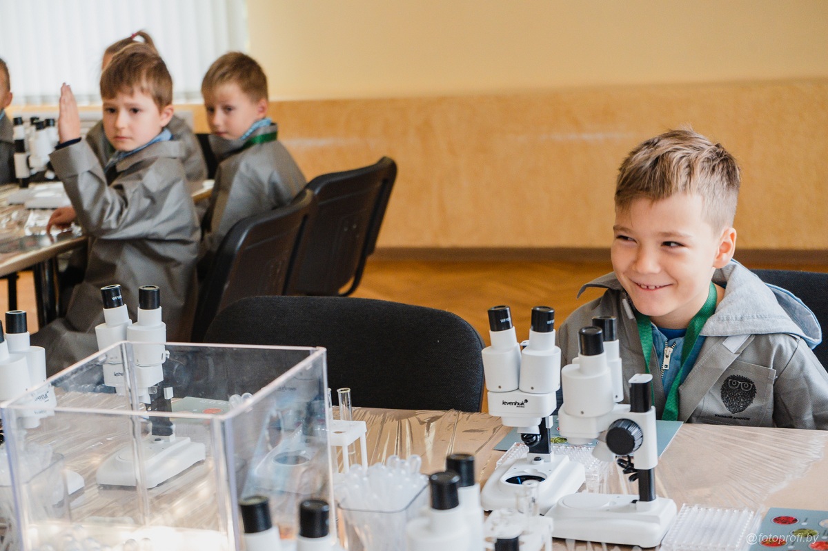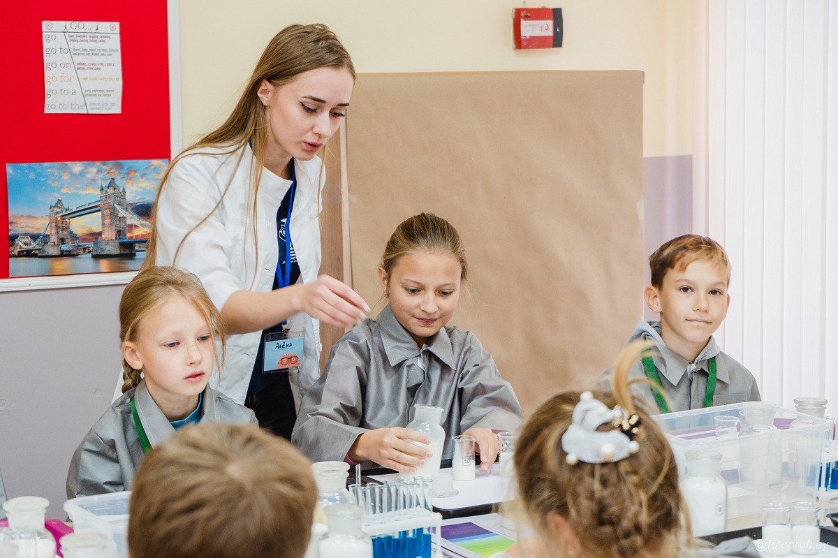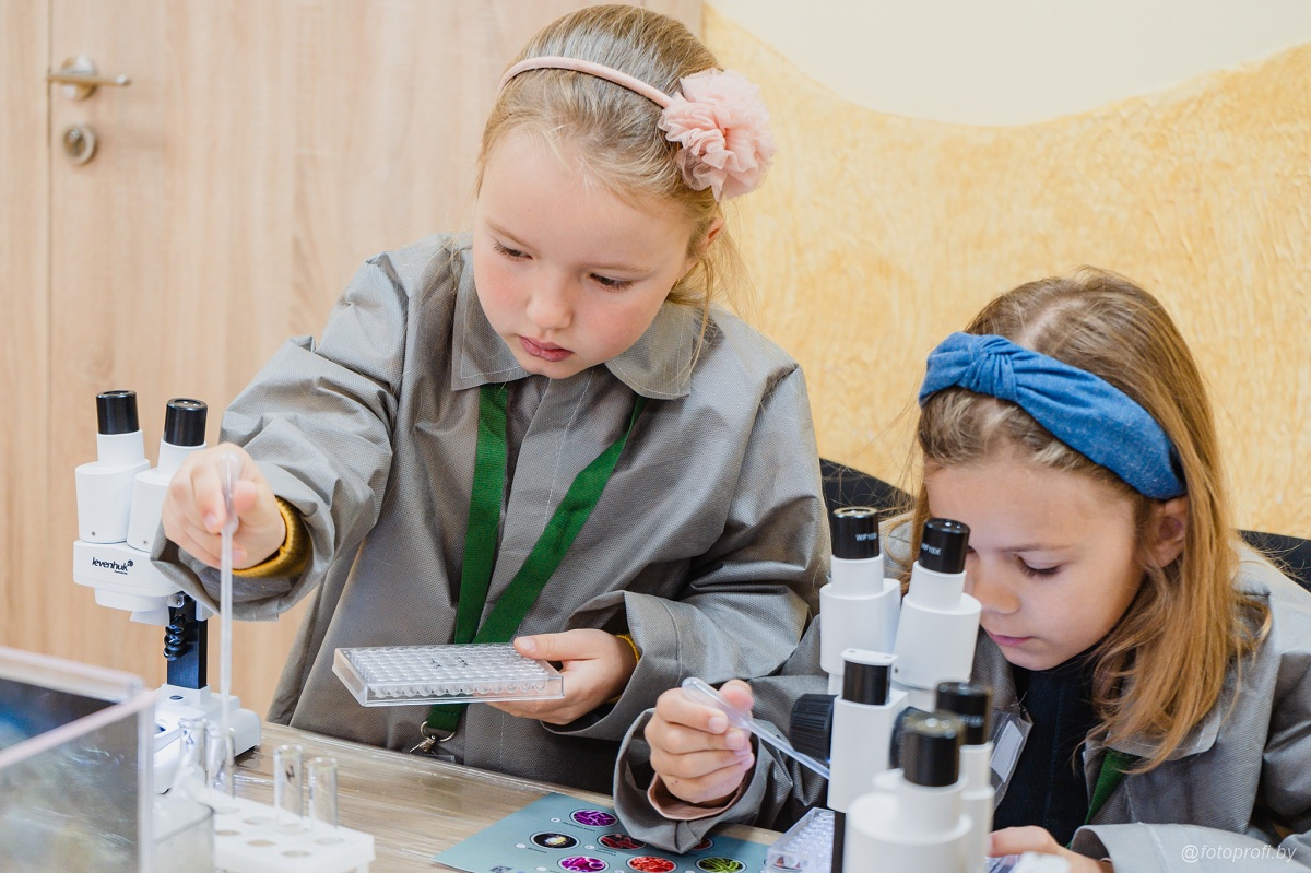 В каждой лаборатории детей встречают два научных сотрудника. И вот ребята занимают свои столы, а на них уже все необходимое: колбы, пробирки, микроскопы, пипетки… Пора за работу!