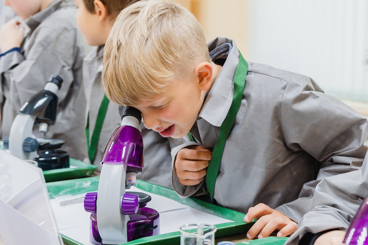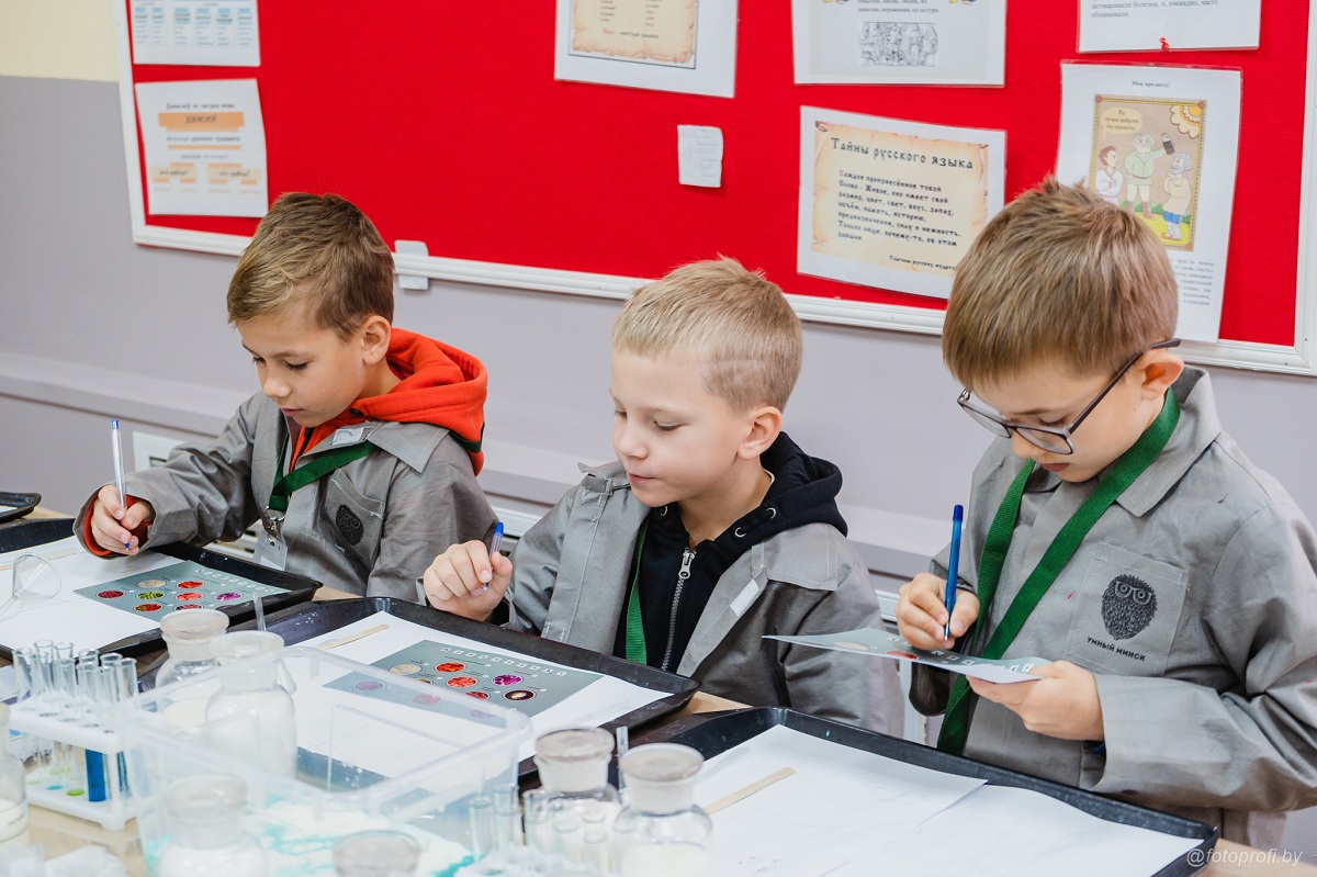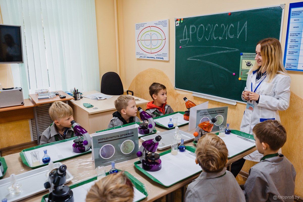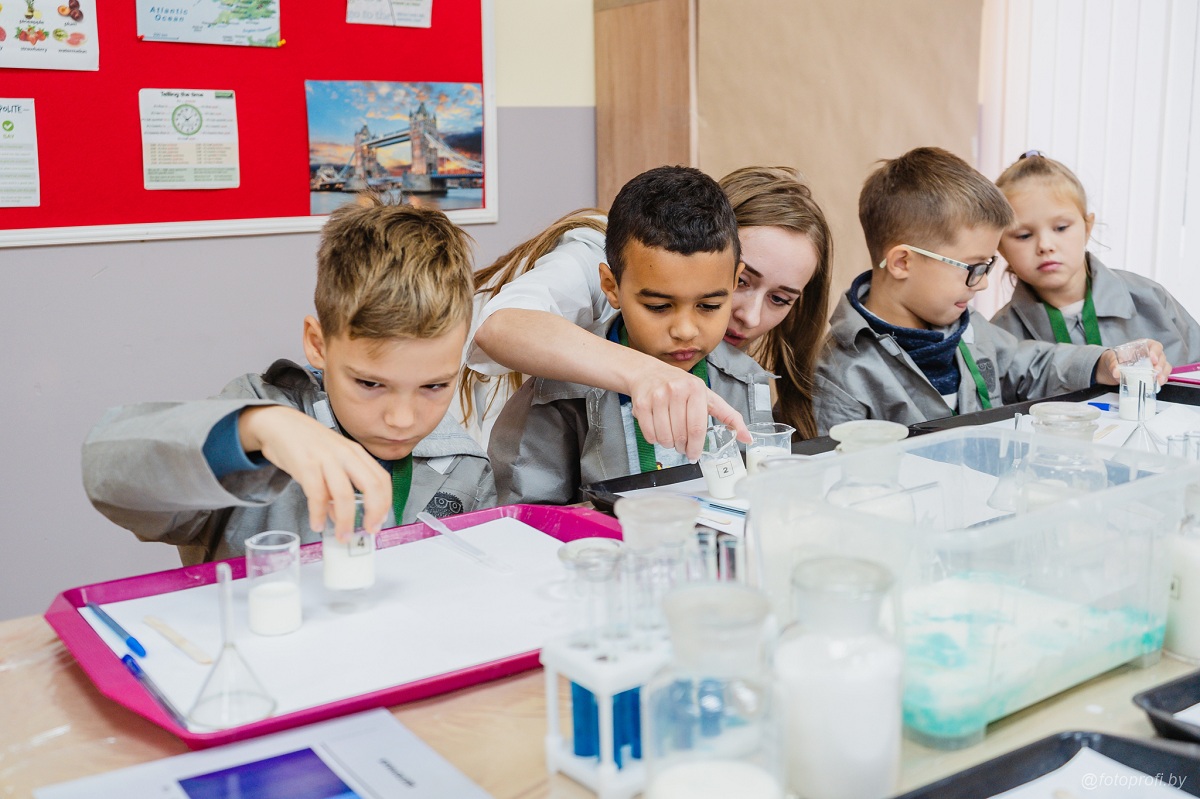 В каждой лаборатории детей встречают два научных сотрудника. И вот ребята занимают свои столы, а на них уже все необходимое: колбы, пробирки, микроскопы, пипетки… Пора за работу!
