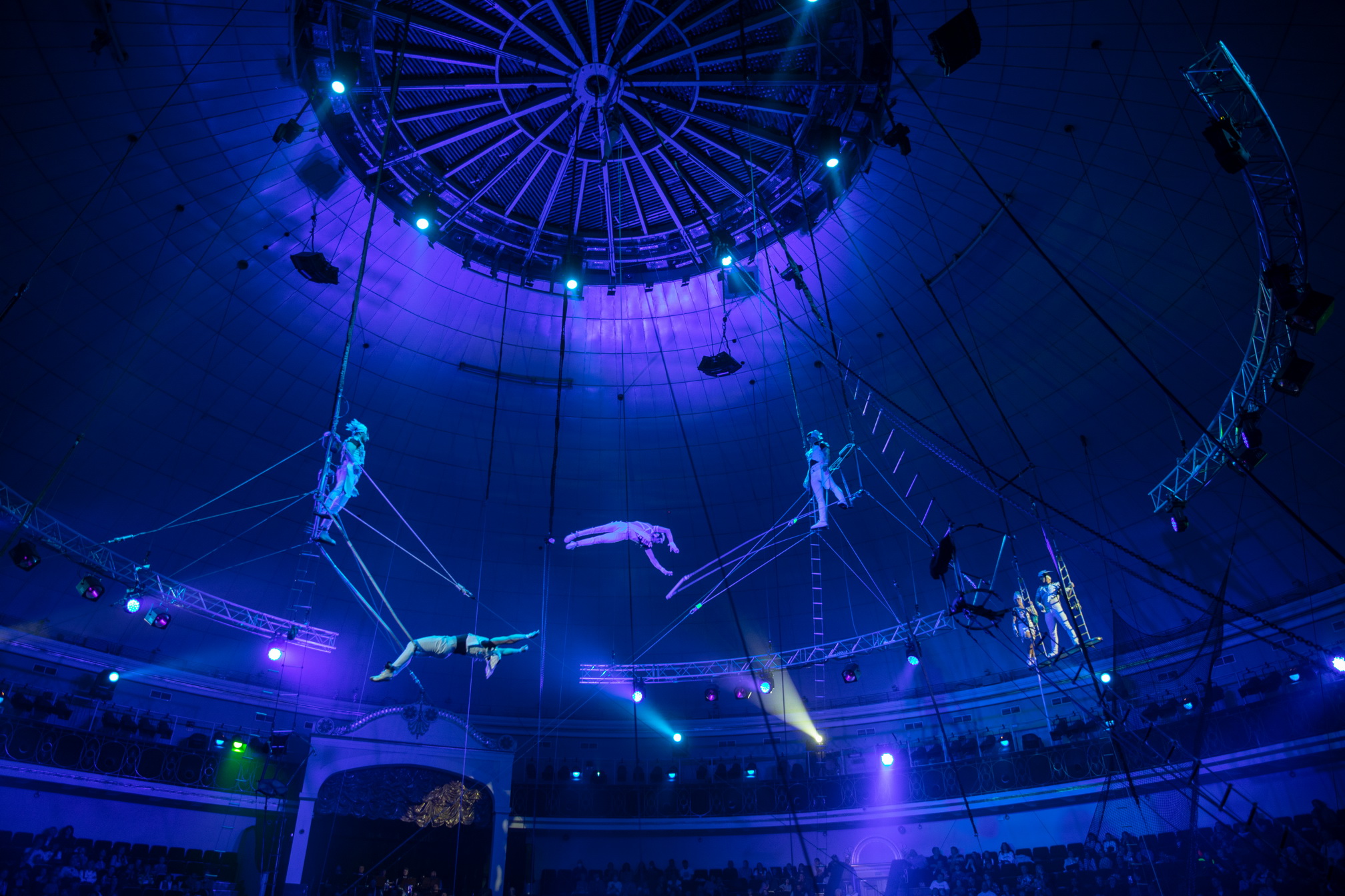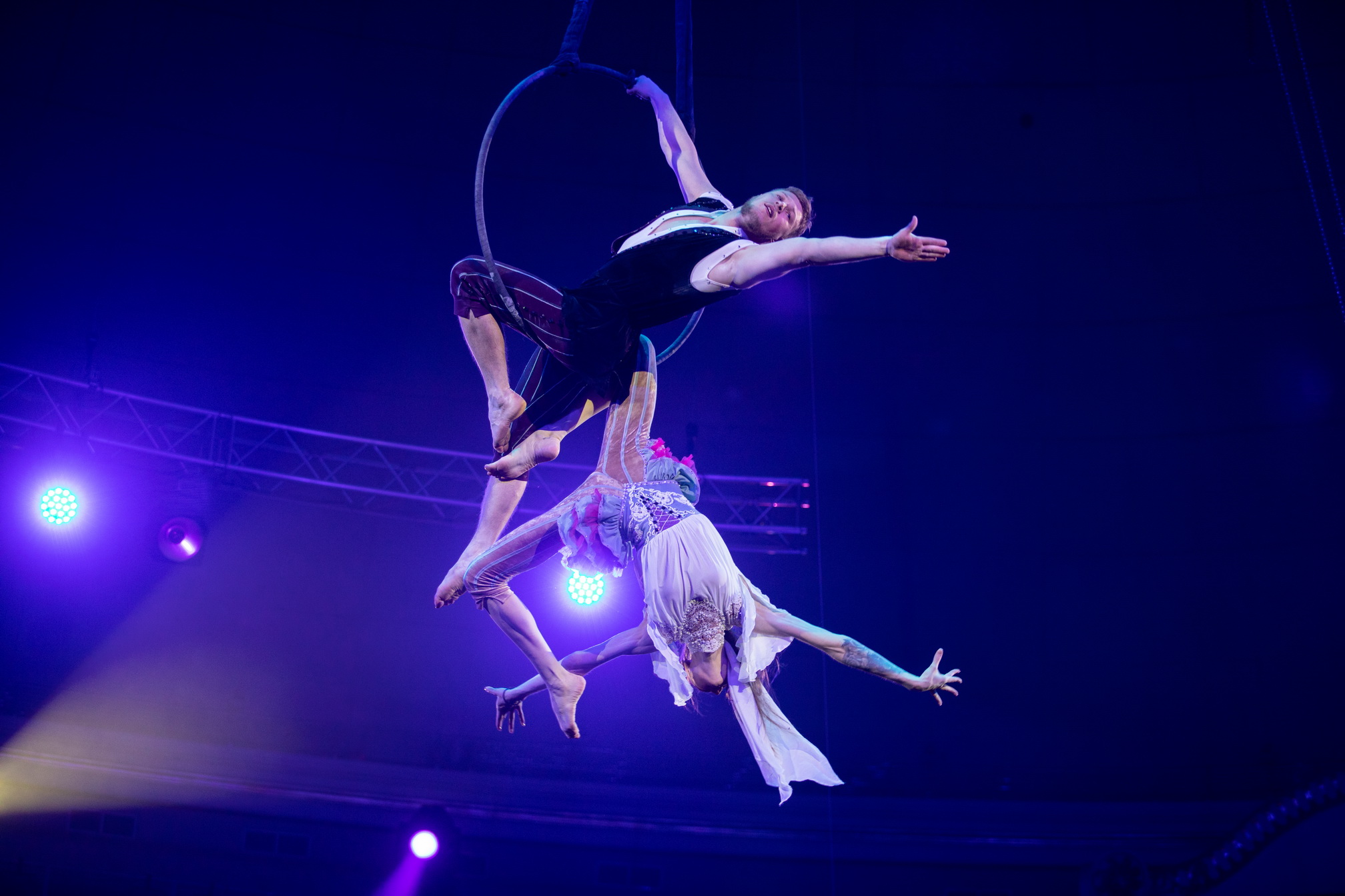 Как только ведущий поведал о своих планах, на манеже сразу же началось представление. Под самым куполом Андрей Погорелов выполнил опасные трюки: на большом «колесе смелости» артист летал, прыгал на скакалке, бегал по кругу – и все это с закрытыми глазами. Каждый элемент зрители встречали с замиранием сердца и восторженными аплодисментами.
