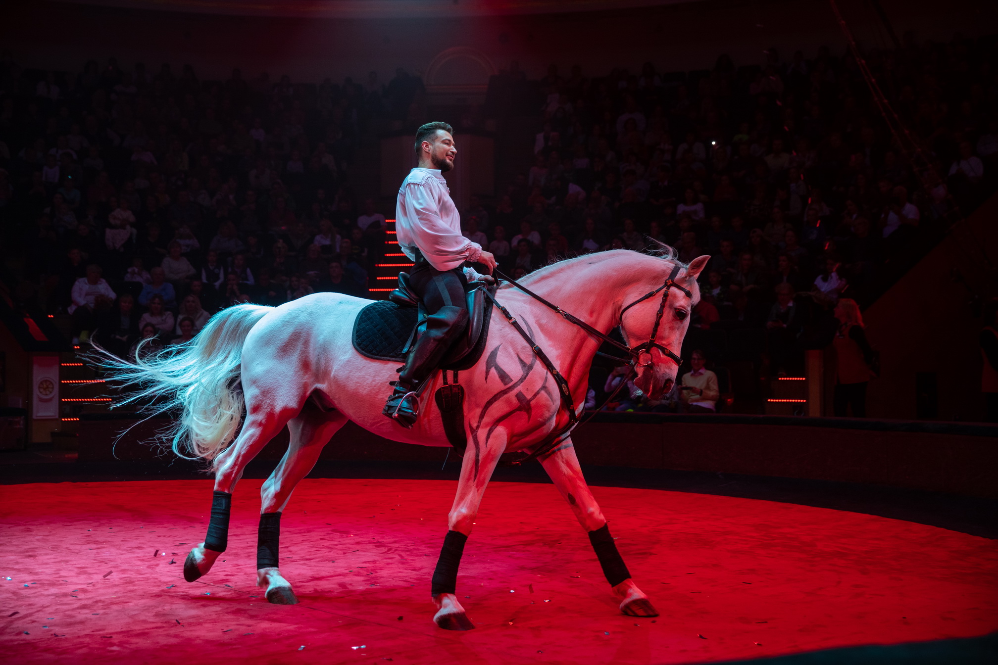Не менее лихо по манежу бегали грациозные лошадки. «Белорусские наездники» под звуки аутентичной музыки стремительно проносились верхом на лошадях, исполняя трюки на высокой скорости: прыгали, поворачивались на 180 градусов, ездили без рук. Более изящно и царственно выступил белый наездник на невероятно красивом коне, который танцевал в такт музыке, а в самом конце аристократично поклонился добродушной публике.