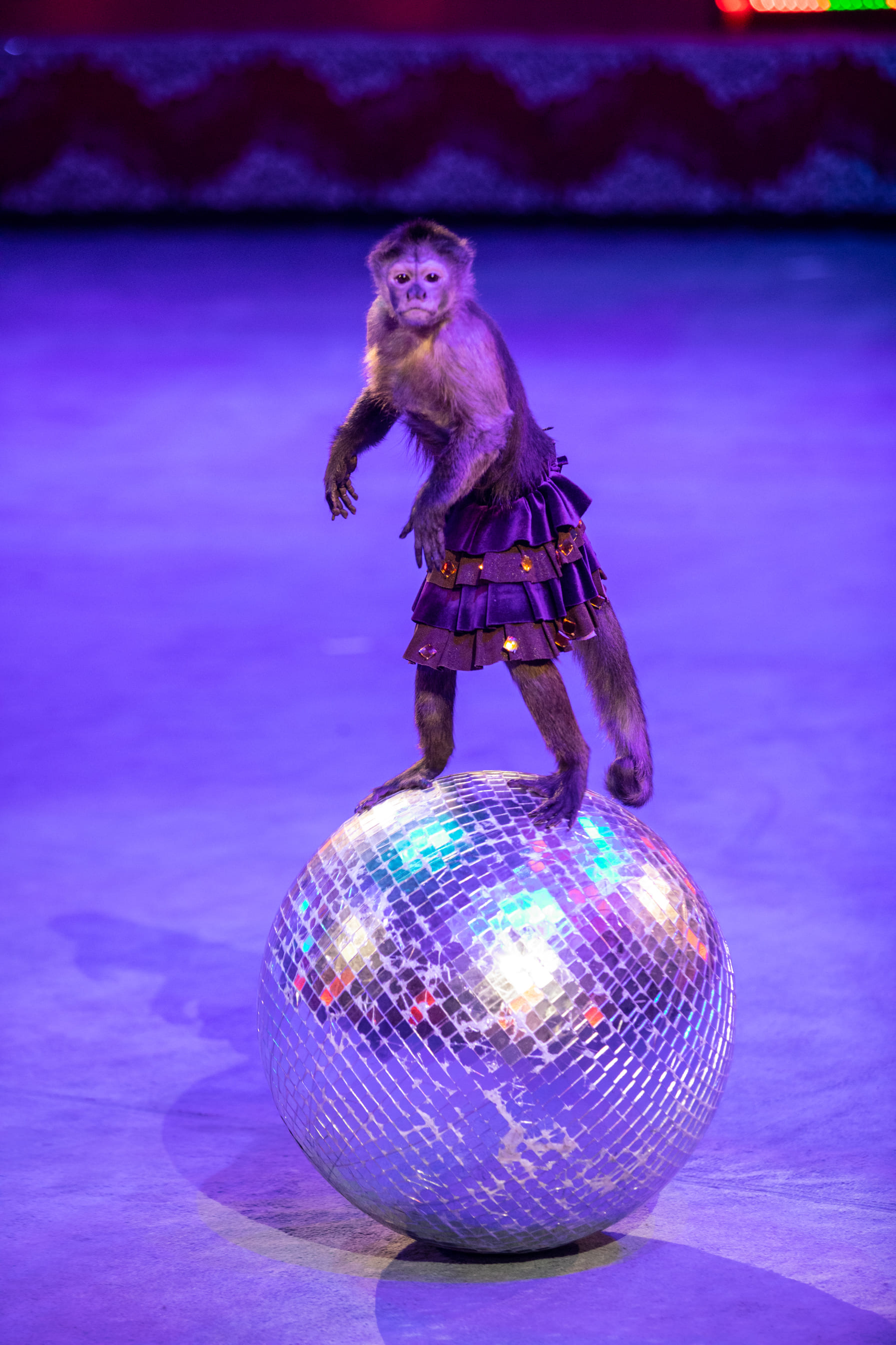 Еще больший восторг у маленьких зрителей вызвали обезьянки. Приматы показали, что им точно можно выдавать права на вождение любого транспорта: велосипеда, автомобиля и, вы не поверите, даже дирижабля! Смелая обезьянка пролетела почти весь зал, попутно осыпая зрителей конфетти.