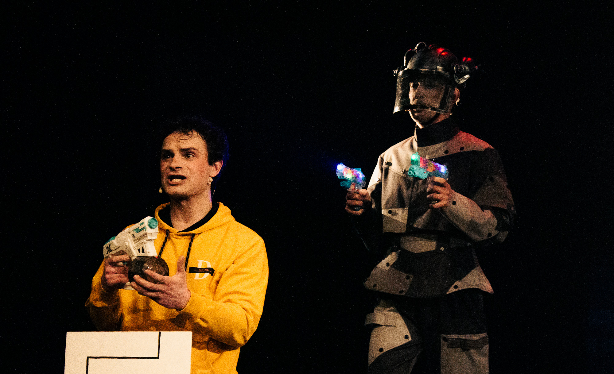 Примечательно, что погружение в виртуальный мир у зрителя также проходит через экран, который установлен на сцене. Через размытые пространства и «пиксельный трафарет» на голом полотне мальчишки и девчонки переходят с уровня на уровень: от городка строителей-пиксель до императорского тронного зала. Экран четко создает место действия, а уже актеры и зрители наполняют его сюжетом.