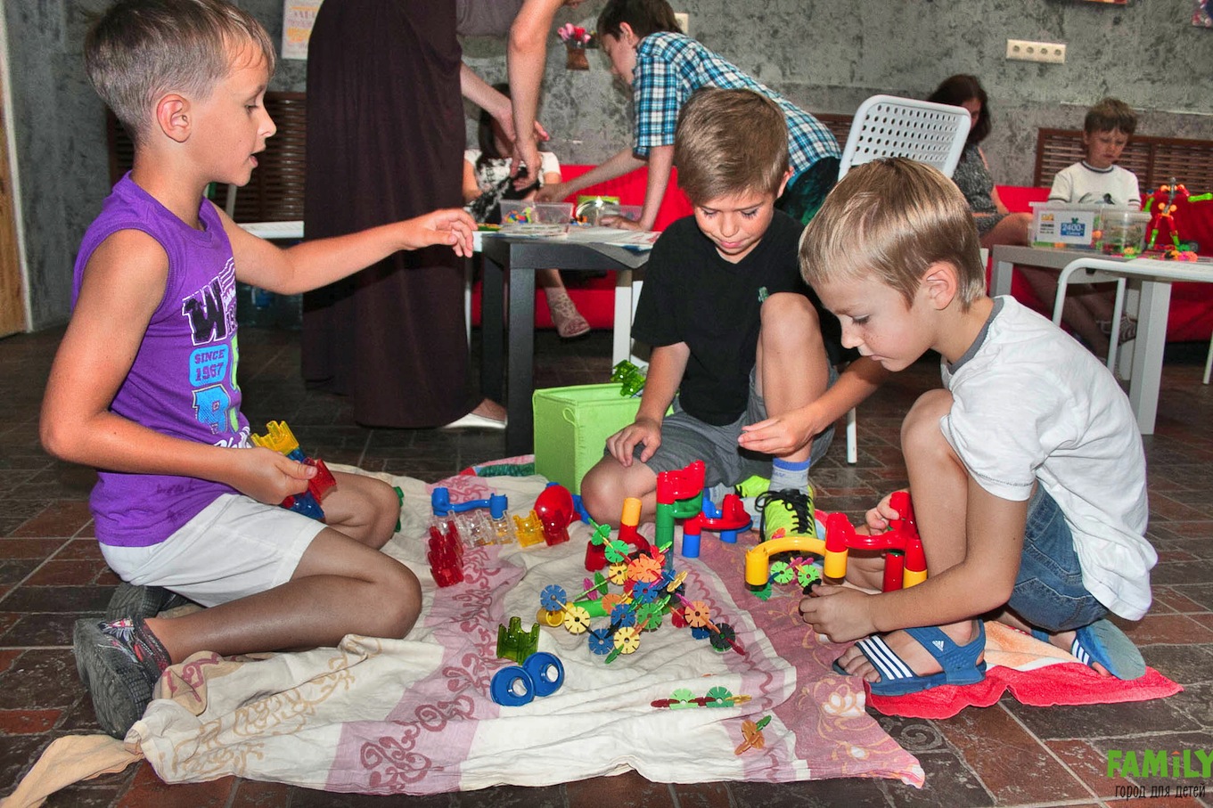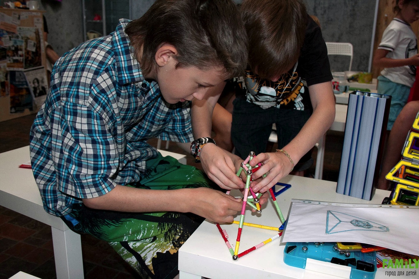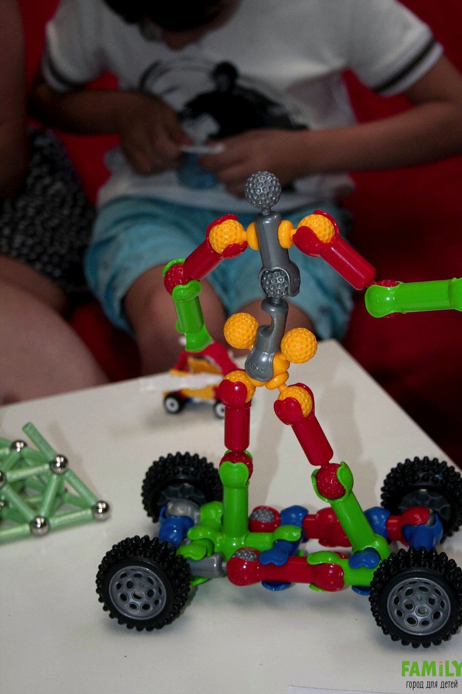 Пока младшие оккупировали второй этаж, старшие в тишине и спокойствии могли полностью отдаться настоящему полету фантазии, строя роботов, дома, ракеты, машинки из мелких деталей, магнитов и других конструкторов. Некоторые дети так и просидели все два часа за одним столом, создавая шедевры и изучая свойства магнита. Два мальчика даже пытались смастерить вращающейся магнитный шар внутри геометрической фигуры, но, к сожалению, у них не получилось. Правда, этот факт их не огорчил, и ребята переключились на другой конструктор, собрав настоящего робота.
