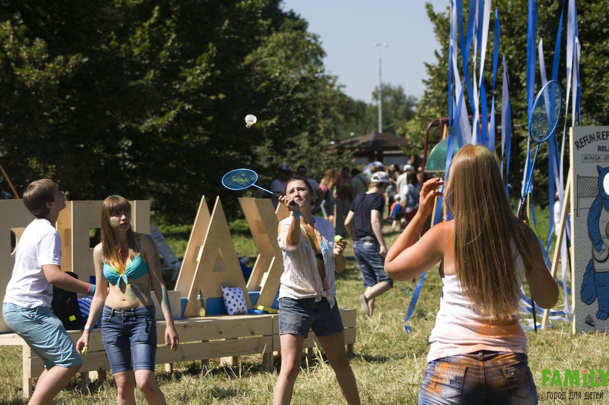 Дальше красивые, яркие, счастливые взрослые и дети переходили в следующую зону «Игротека Relax.by». Здесь процветала здоровая спортивная конкуренция под зажигательную музыку. Все, кто желал, могли покидать фрисби, поиграть в бадминтон, построить башню из коробок, проверить себя на гибкость и ловкость, в полумостике проходя под палочкой. А пока дети пробовали всевозможные развлечения, родители могли полежать на шезлонгах или посидеть на длинных деревянных скамьях.