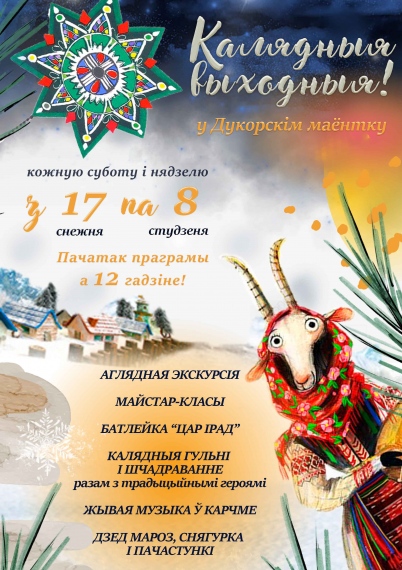 Кожную суботу і нядзелю з 17 снежня па 8 студзеня у Дукорскім маёнтку вас чакаюць пазнавальныя экскурсіі, вясёлыя гульні, жывая музыка і ўтульная атмасфера. Таксама з 13.00 па 16.00 Вы зможаце сустрэцца з Дзедам Марозам ды Снягуркай.