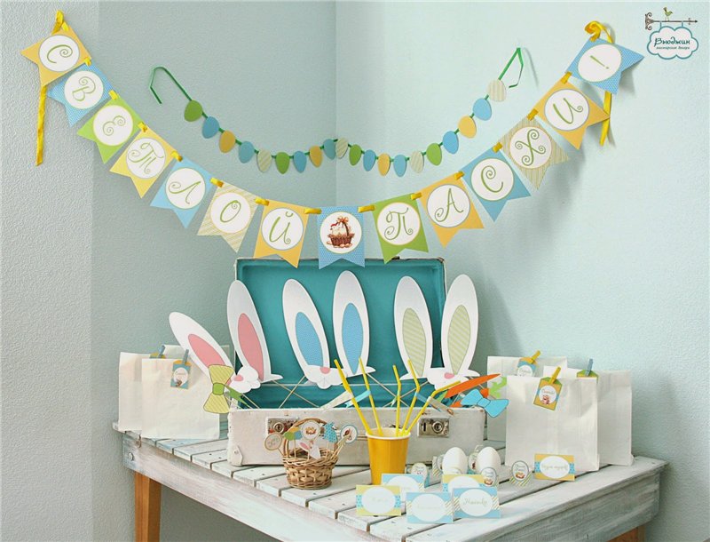 - Гирлянды. Их сделать очень просто и достаточно быстро. Необходимо вырезать одинаковые элементы из цветной и дизайнерской бумаги. Растяжки могут быть с яйцами, зайчиками, цыплятами, курочками, скворечниками, цветочками. Растяжку можно также сделать из разноцветных ярких ленточек, навязанных на веревочку;