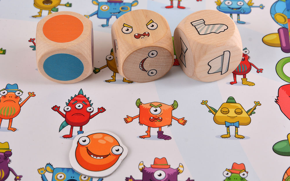 Правила: в наборе поле с Чубриками и три кубика. Первый указывает на цвет, второй - на эмоциональное состояние, третий - на какой-то элемент. По выпавшим признакам ребенок должен найти подходящего героя как можно быстрее, а затем повторить за ним позу или выражение лица, или и то и другое вместе. Тот, кому удалось это сделать быстрее всех, получает фишку. У кого их больше - тот и выиграл.
