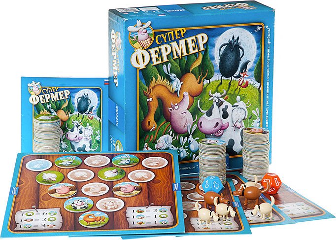 Правила: В самом начале игроки получают по одному кролику, а затем делают все возможное, чтобы увеличить поголовье животных на своей ферме. Получив необходимый опыт, фермер может обменять кроликов на крупный рогатый скот или собак, которые охраняют животных от лисы и волка. Чтобы приобрести животное, надо бросить два кубика. Когда стадо будет достаточно велико, игроки могут обмениваться животными, например, за 6 кроликов дают 1 овечку или за 1 коня - 2 коровы. Лучшим станет тот фермер, в хозяйстве которого будет не менее 1 головы каждого животного.