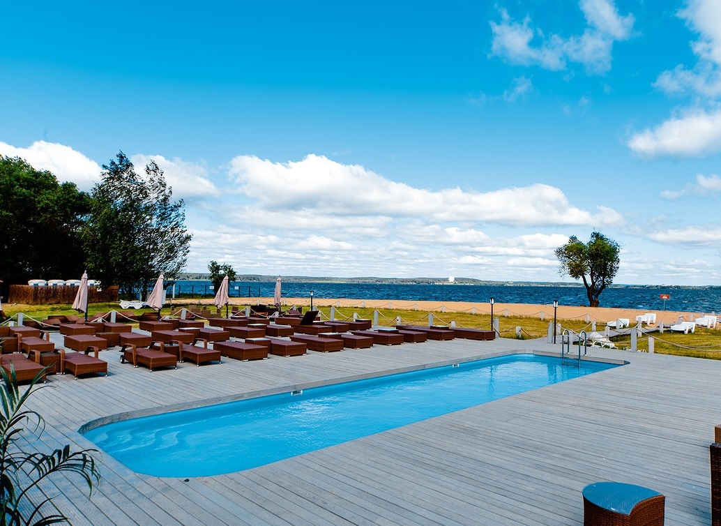 Закрытая терраса – это помещение с панорамным остеклением в пол, которое открывает потрясающий вид на воду. Открытая терраса – это комфортабельная чил-аут зона с креслами, столиками, диванами, открытым бассейном и лежаками. Здесь есть летний бар, а рядом с террасой зеленая зона с детской площадкой.