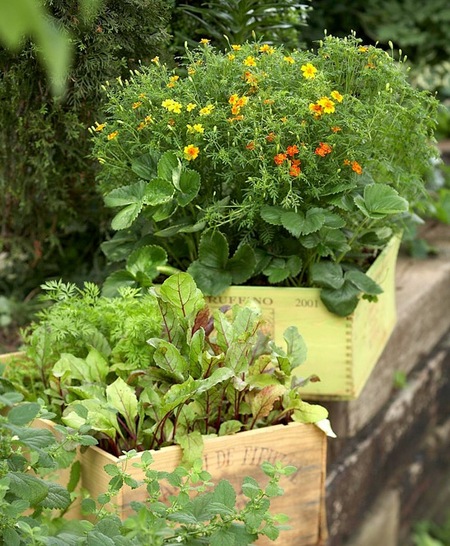 Отличным вариантом для посадки домашнего огорода с детьми станут деревянные ящики, которые можно взять на рынках или в супермаркетах (в них обычно завозят фрукты и ягоды). Если древесина не повреждена, то она станет только украшением. Кстати, в таких ящиках прекрасно растет лук, редиска и зелень.