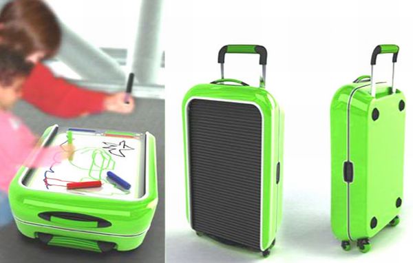 Дизайнер Marcial Ahsayane из Бельгии задумалась, чем бы занять ребенка в аэропорту и создала чемодан, на котором можно рисовать без риска быть наказанным. На боку чемодана есть специальная шторка, которая при необходимости скрывает белую доску для рисования. А рисовать можно чем угодно: фломастерами, карандашами, мелками.
