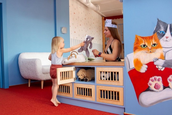 Просторный детский клуб-кафе «Два кота» с двумя игровыми комнатами предлагает услугу «Няня». Родители могут оставить ребенка под присмотром бебиситтера на час или более. В это время ребенок точно не будет скучать, ведь в его распоряжении будет большой игровой комплекс, который выглядит, как разрез кукольного домика в большом размере, где есть разные игровые зоны. А еще настольные игры, книги, мягкие игрушки, сухой бассейн.