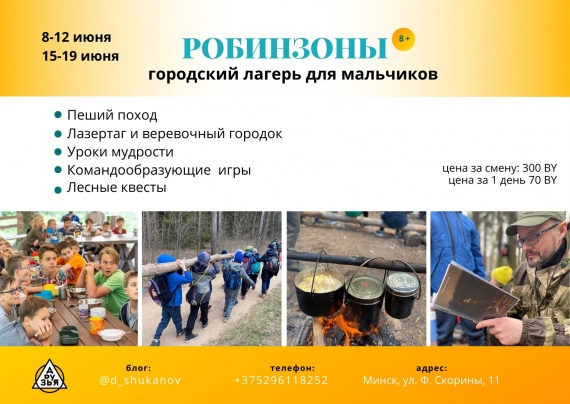 Городской лагерь «Робинзоны» для мальчиков от 8 до 14 лет. Смена 8-12 июня, 15-19 июня (место проведения г.Минск, ул.Скорины, 11 лесопарковая зона Уручье).