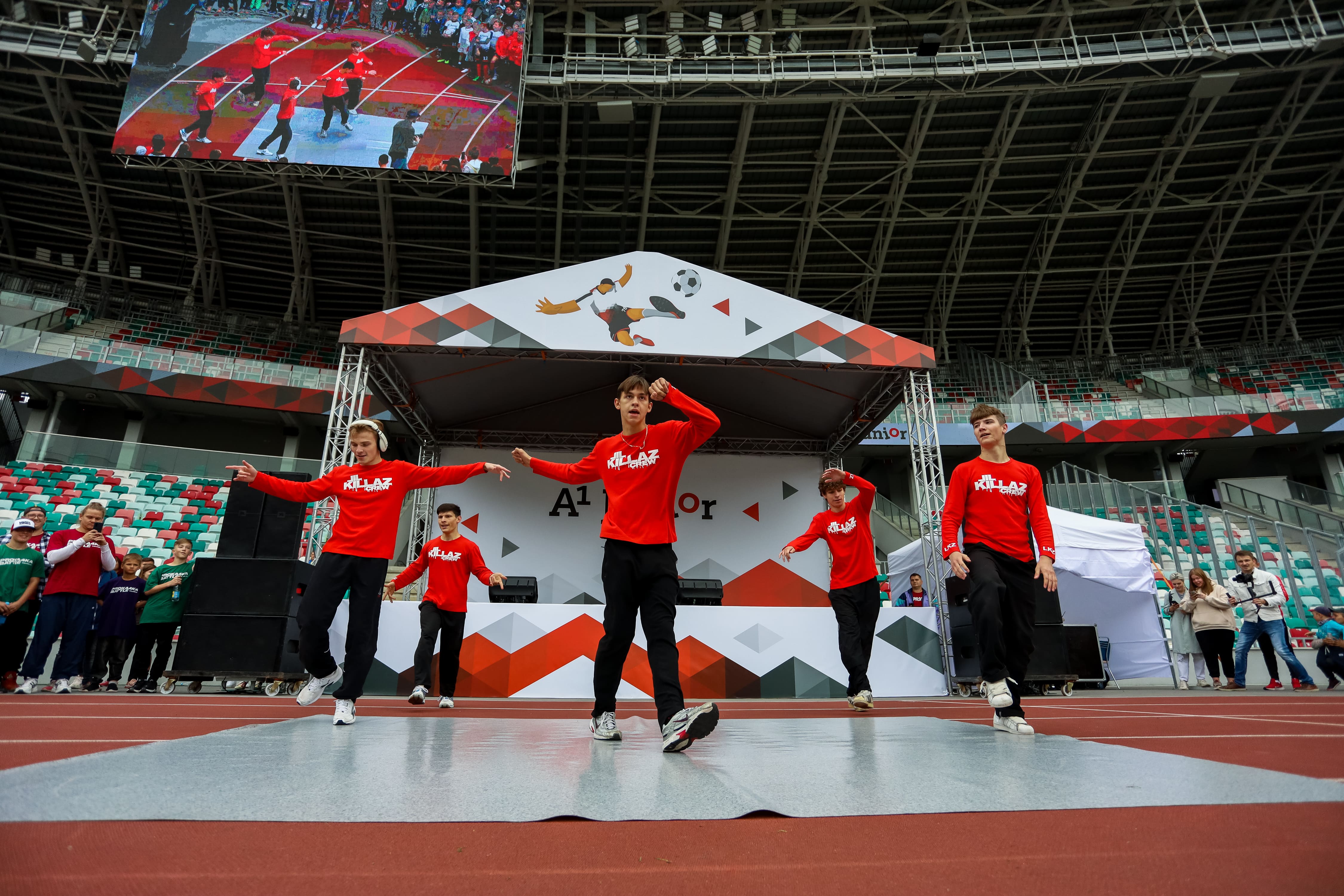 Тренировка началась в 12.00. Но не с футбола, а с драйвового номера команды по брейк-дансу «Hunter School». Команда зарядила гостей мероприятия энергией для физических упражнений, которые начались с танцевальной разминки на футбольном поле стадиона «Динамо». Юные спортсмены старательно выполняли задания тренера, после чего отправились проверять свои навыки в других активностях.