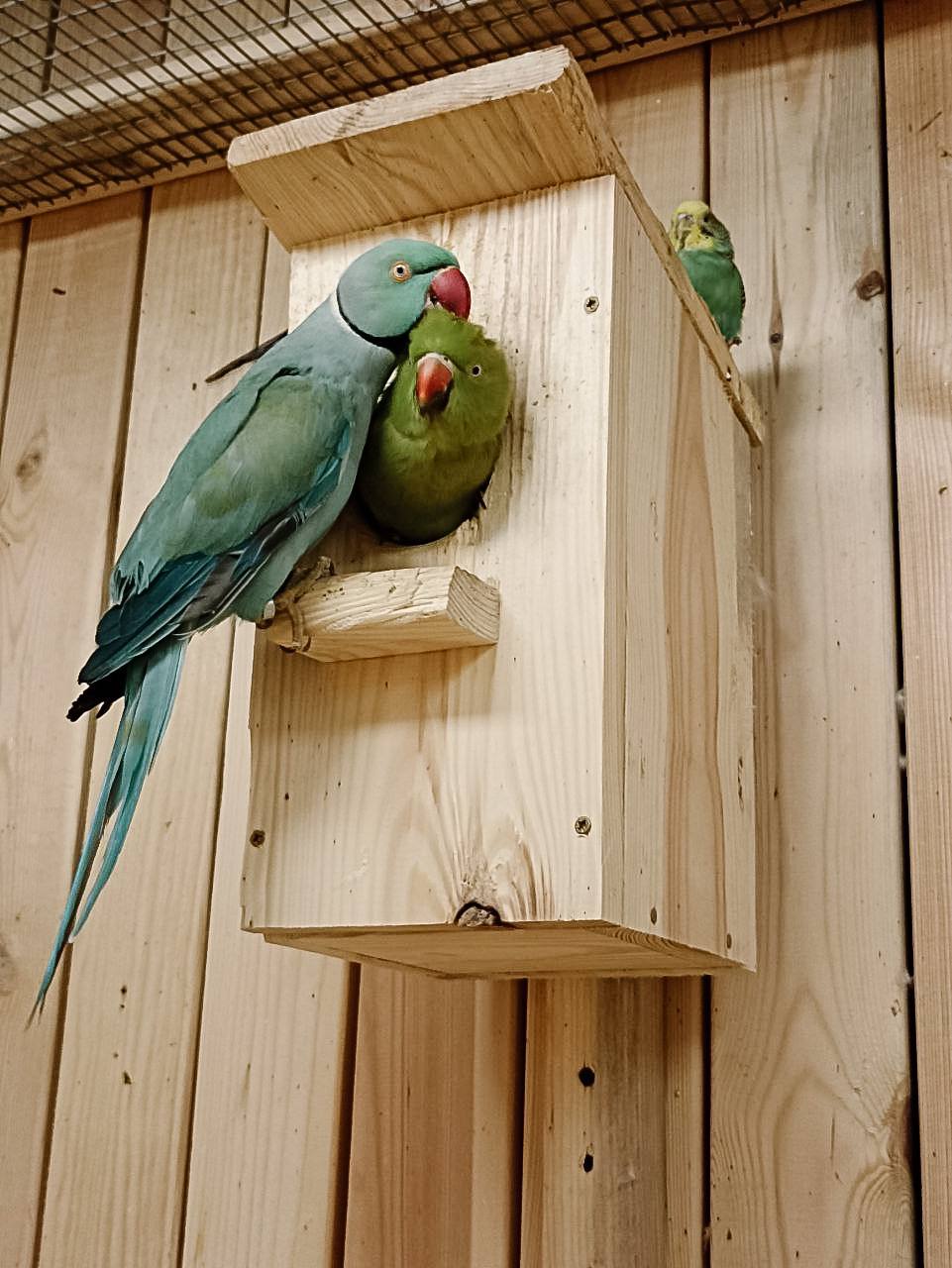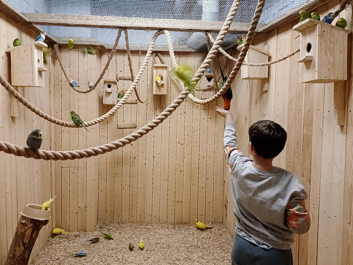 Инструктаж прошли – можно заглянуть за дверь. Дверь самая обычная, зато за ней шум, гам, безумные полеты и новые впечатления. На 70 квадратных метрах, а это три открытые комнаты, три сотни попугаев: неразлучники, волнистые, молуккский какаду, жако, эклектусы, попугай Крамера, скалистый попугай, какарик, корелла, аратинга солнечная и многие другие. Все они свободно летают, сидят на скворечниках, свисают с канатов, пьют из поилок и общаются с гостями.