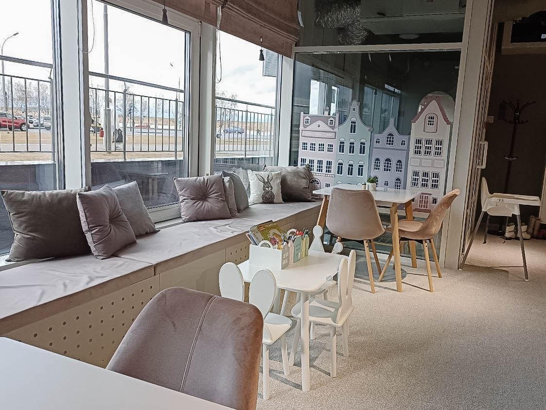 Итак, мамы могут спокойно общаться, работать или отдыхать за уютными столиками возле большого панорамного окна, из которого открывается приятный вид на город, а дети отдаться играм. Кстати, окна в игровой всегда закрыты, чтобы не было сквозняков. За свежий воздух здесь отвечает система рекуперации и кассетный кондиционер. В помещении всегда комфортная температура.