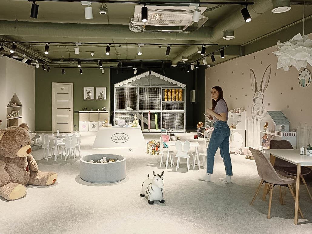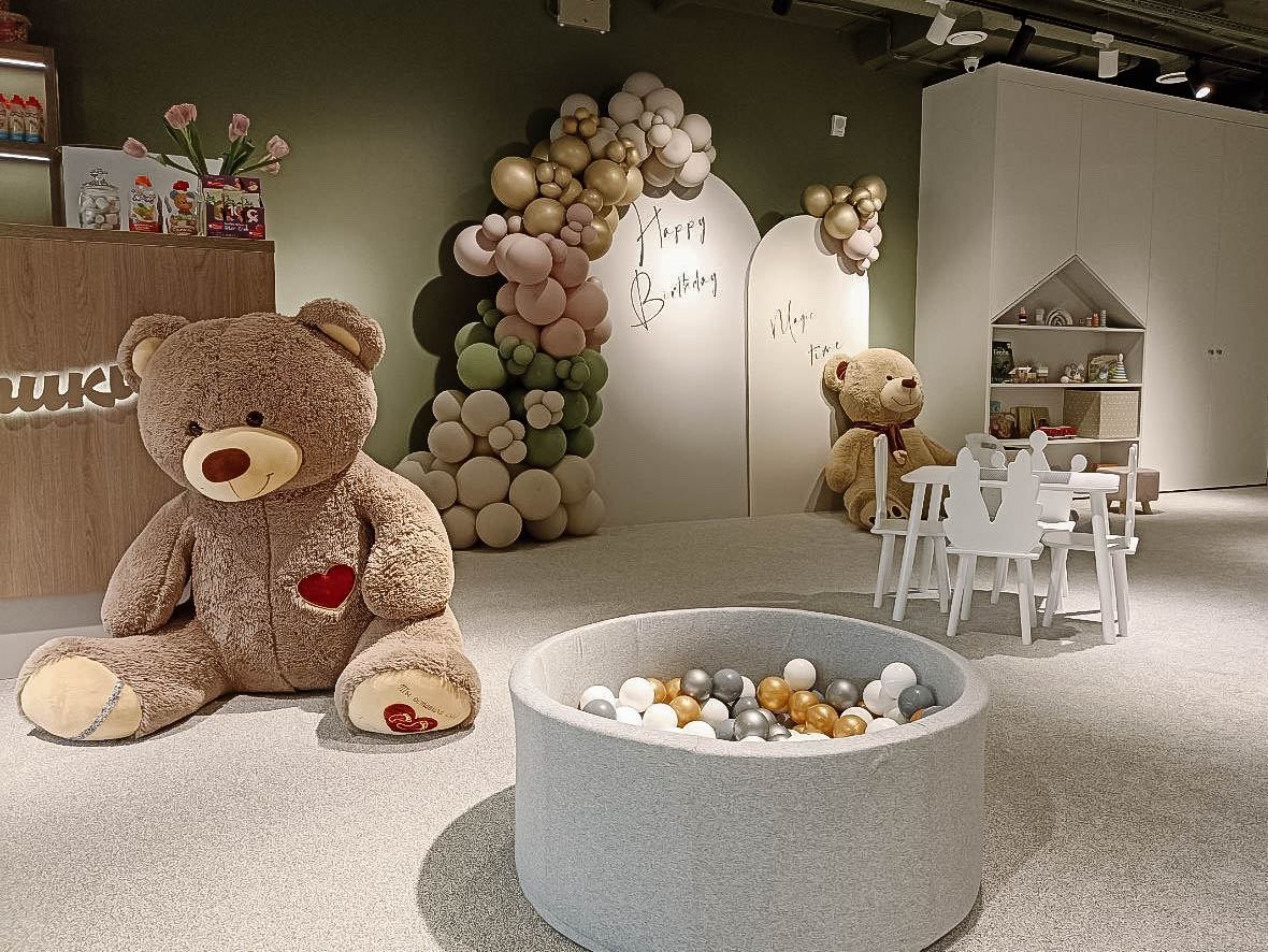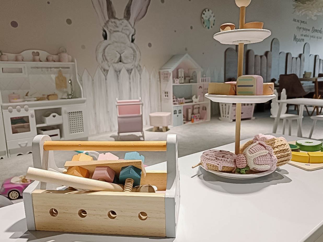 Для малышей выбор гораздо больше. Каждый сможет найти игрушку или занятие по интересам. Хочешь, попробуй себя в роли кассира за детским уголком в центре помещения – здесь установлена детская касса с импровизированными продуктовыми полками. Не хочется быть кассиром? Тогда добро пожаловать в мастерскую, где можно постучать молоточком. Либо поиграть в кукольный домик и детскую кухня, устроить гонки на парковке, причем машинки есть как игрушечные, так и в стиле ретро, на которых можно кататься по игровой. Если не хочется кататься, но энергии много – смело пробуй комплекс с горкой и лабиринтом.