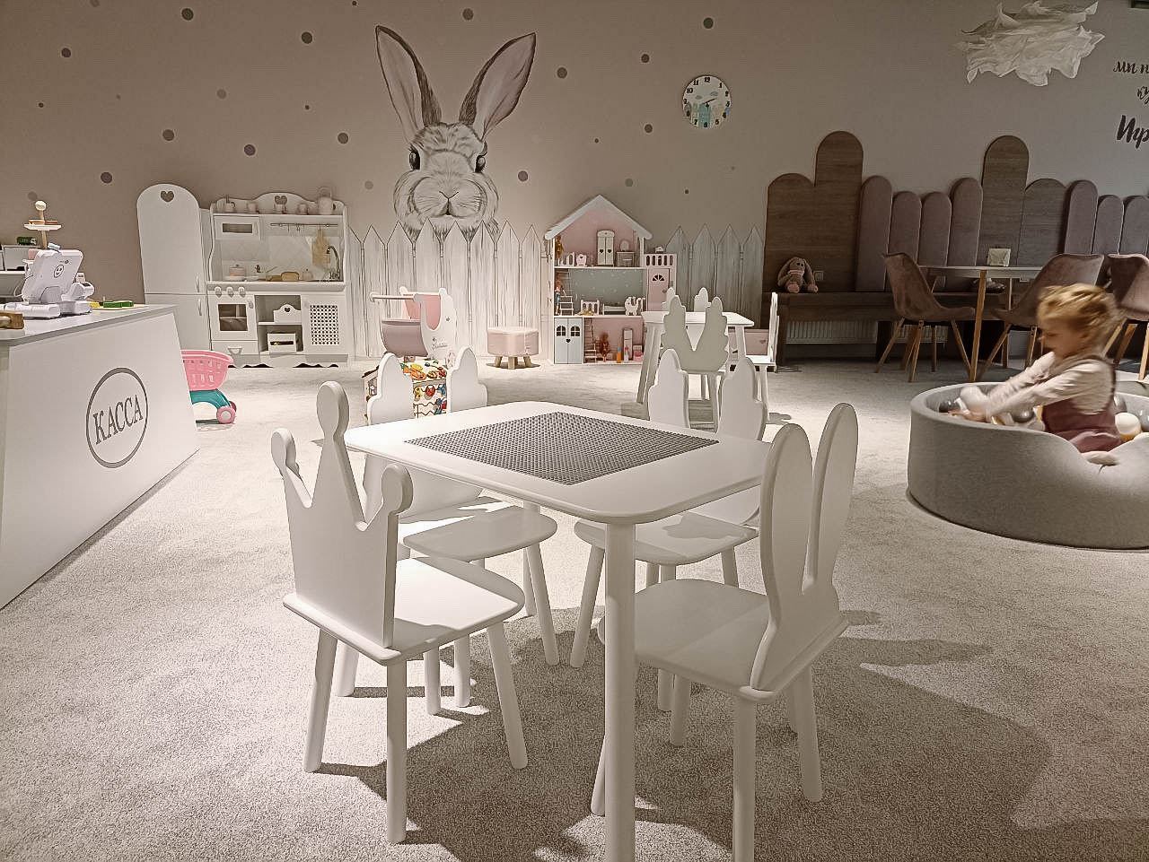 Интерьер игровой «Лютик» выполнен в спокойных, натуральных тонах, чтобы не будоражить психику ребенка. На стенах фотографии и рисунки милых кроликов - они же приглашают гостей на вывеске и логотипе.
