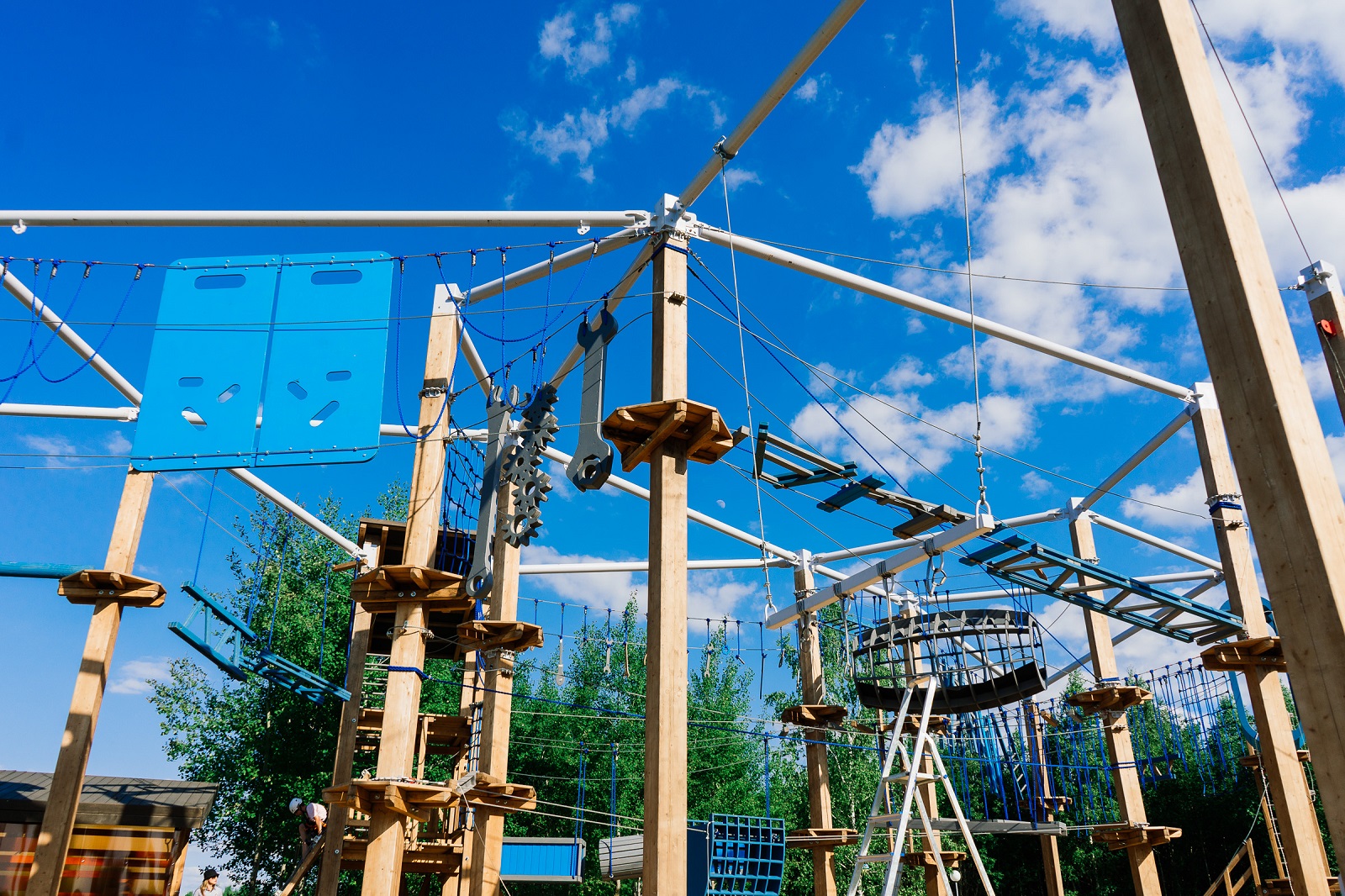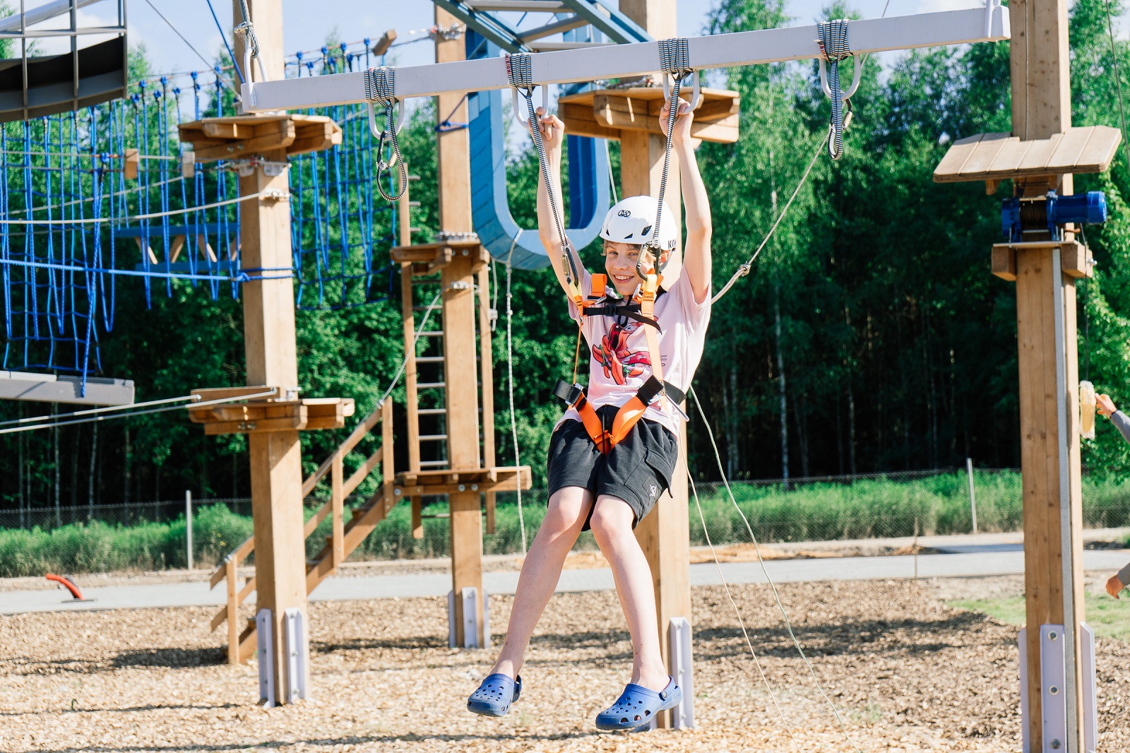 Если пройти вглубь парка, то там вас будет ждать веревочный парк с тремя уровнями сложности. Что приятно, в парке работают сертифицированные тренеры – они всегда следят за детьми и при необходимости помогают пройти маршруты.