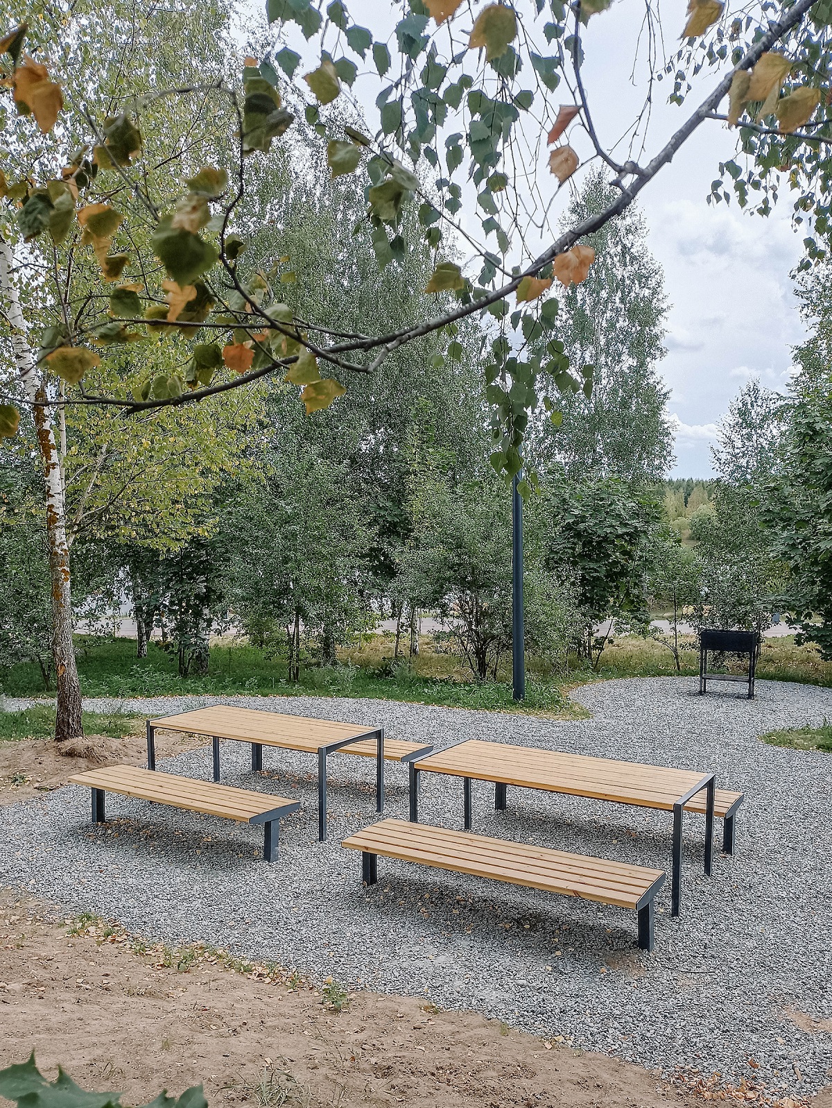 Дети точно оценят новую детскую площадку с большой горкой. Здесь же есть качели, карусели и песочница. Особенно приятно, что проектировщики подумали о родителях и рядом поставили столы и скамейки под навесом. Тут же установлен туалет.