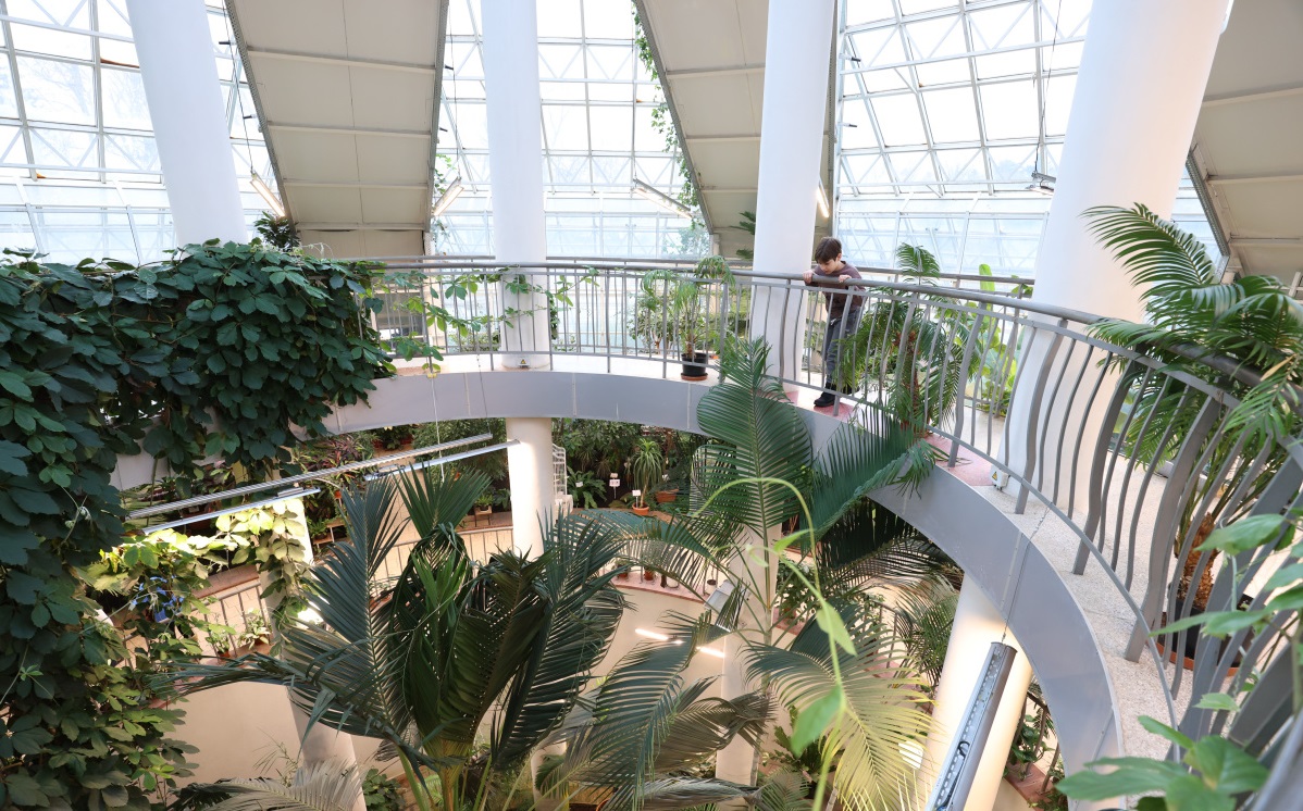 С 2007 года в Ботаническом саду работает экспозиционная оранжерея. Она условно разделена на две зоны: тропики и субтропики. Они отличаются влажностью и температурой. В целом же на территории растут тысячи удивительных растений Центральной и Южной Америки, Африки, Австралии, Юго-Восточной Азии и стран средиземноморья. Проще говоря, тут есть цитрусовые, кактусы, суккуленты, а еще пальмы, лианы, папоротники – все то, что зимой точно не найдешь в парках и лесах. А для пущего эффекта в пруду плавают юркие рыбки, ползают мудрые черепахи и очень громко общаются попугаи.