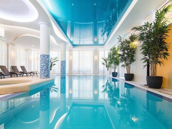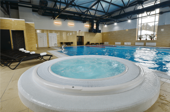 - большим крытым бассейном (5 дорожек, длина 25 метров, глубина от 145 см до 210 см. Температура воды до 27°С);