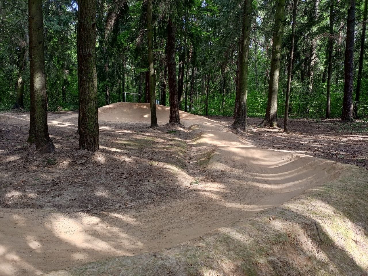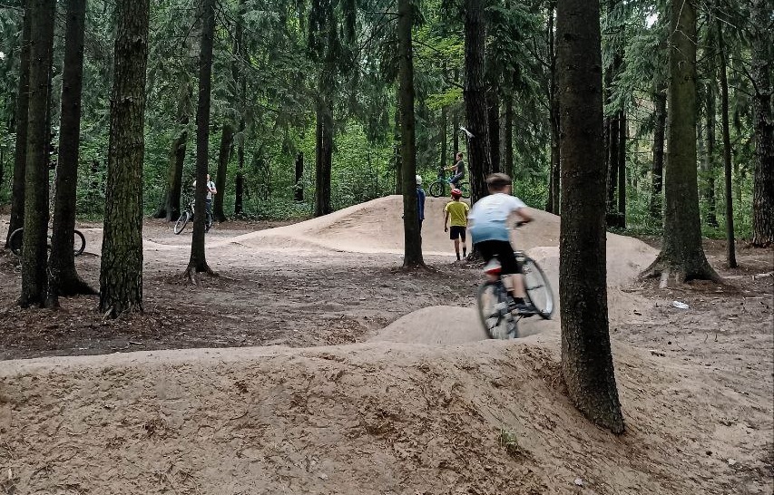 Особое внимание привлекает памп-трек, на котором молодые экстремалы носится на байках. Площадка находится в окружении деревьев, тут хороший воздух и тень. Гонять одно удовольствие.