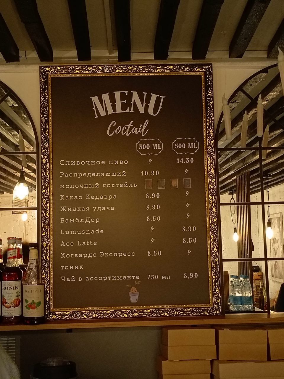 И меню из кафе «Три метлы»: авторские напитки, среди прочего Сливочное пиво (детям разрешается), привычные кофейные напитки, десерты «Распределяющий чизкейк», «Страшная книга», пирожное «Сова» и многое другое.