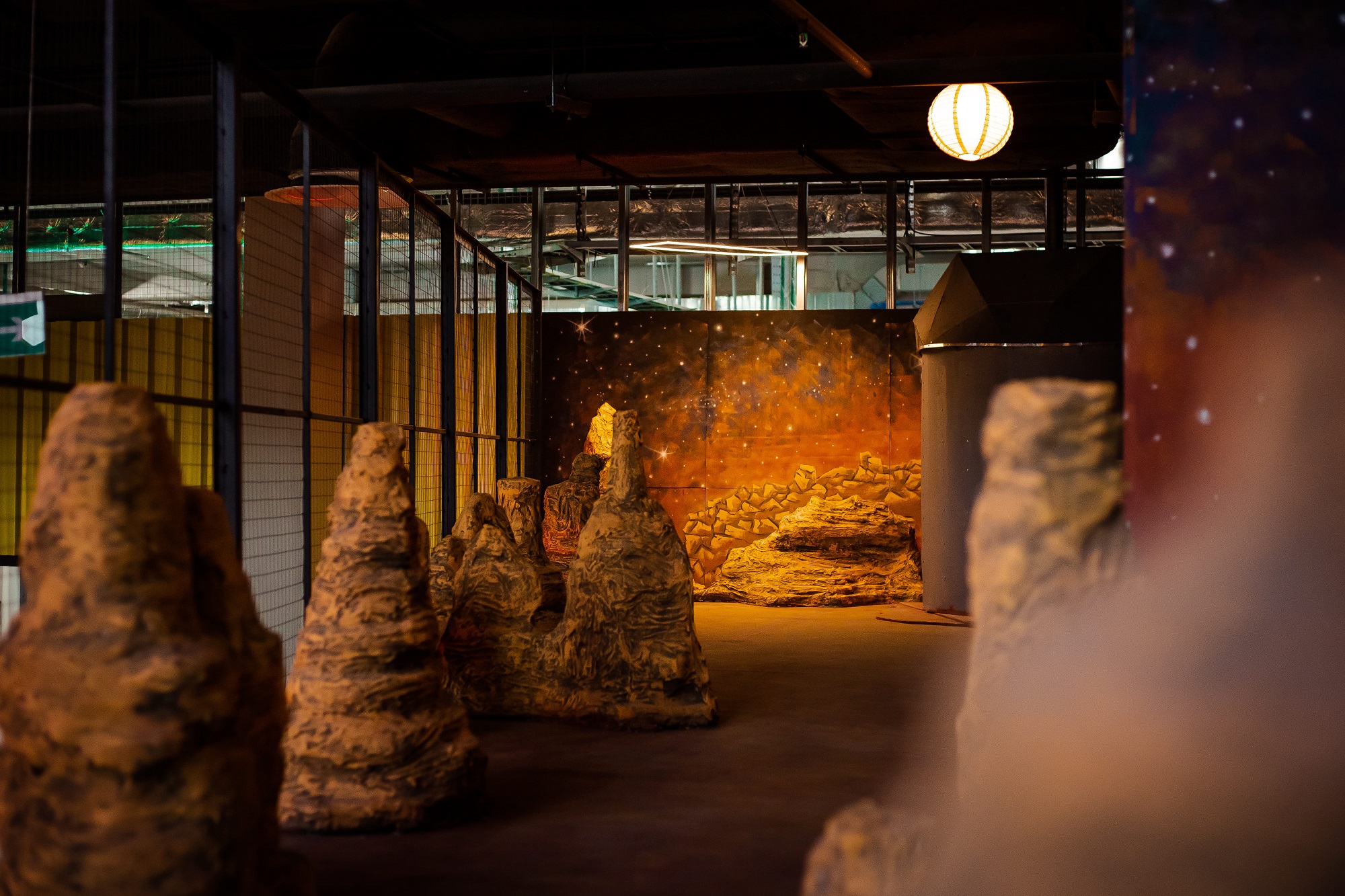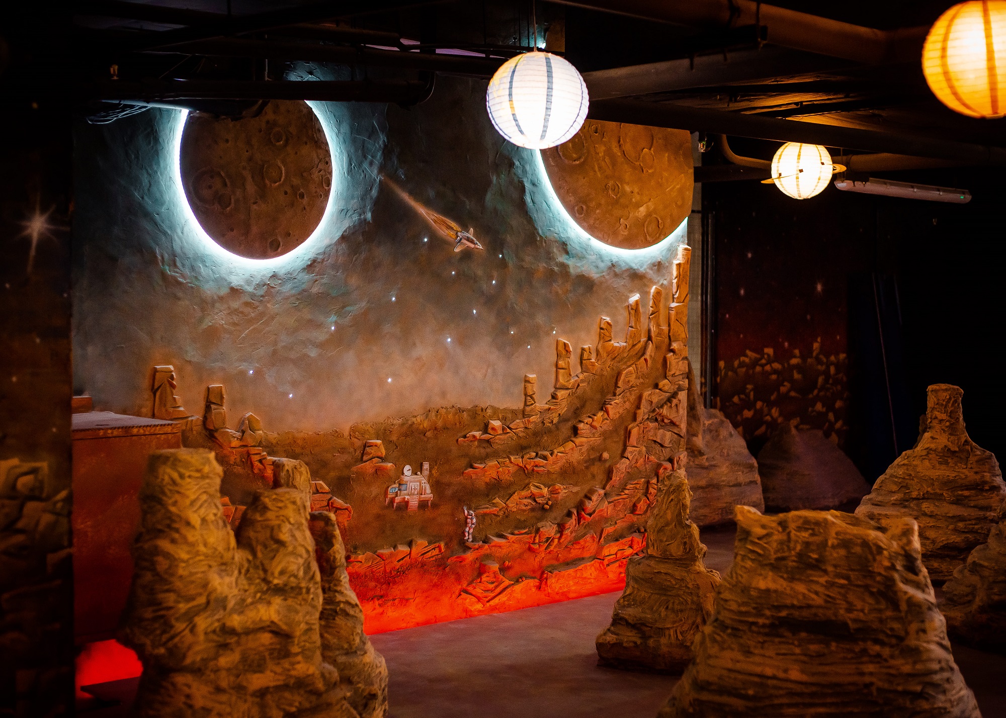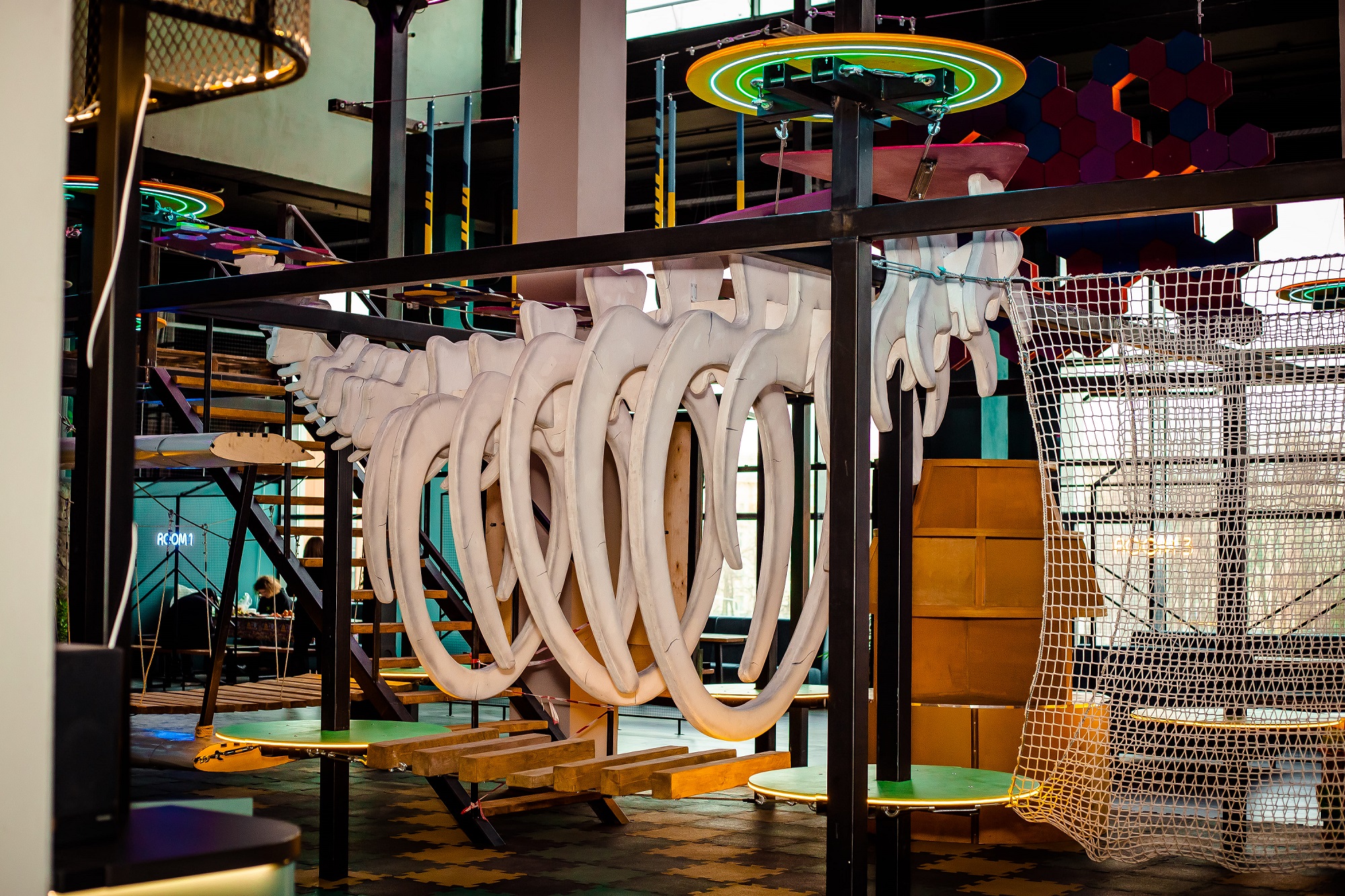 Интерьер новой площадки продолжает традиции первой локации – он выполнен в стиле лофт: свободное пространство, панорамные окна с видом на стадион «Динамо» (если повезет, то можно будет понаблюдать за тренировками спортсменов), стильные граффити и рисунки ручной работы в каждой игровой, продуманные квестовые площадки. А еще уютное освещение, которое, в зависимости от локации, переносит гостей в джунгли, космос или японский квартал.
