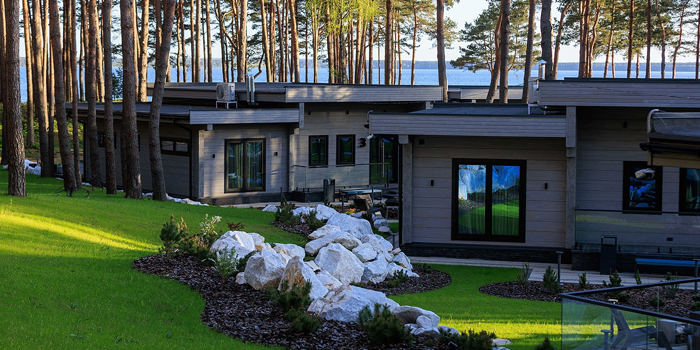 На территории также есть панорамная сауна с подагреваемой купелью, которую желательно бронировать заранее. Рядом со скандинавской деревней есть озеро с пирсом, где можно взять лодку и сапборды.