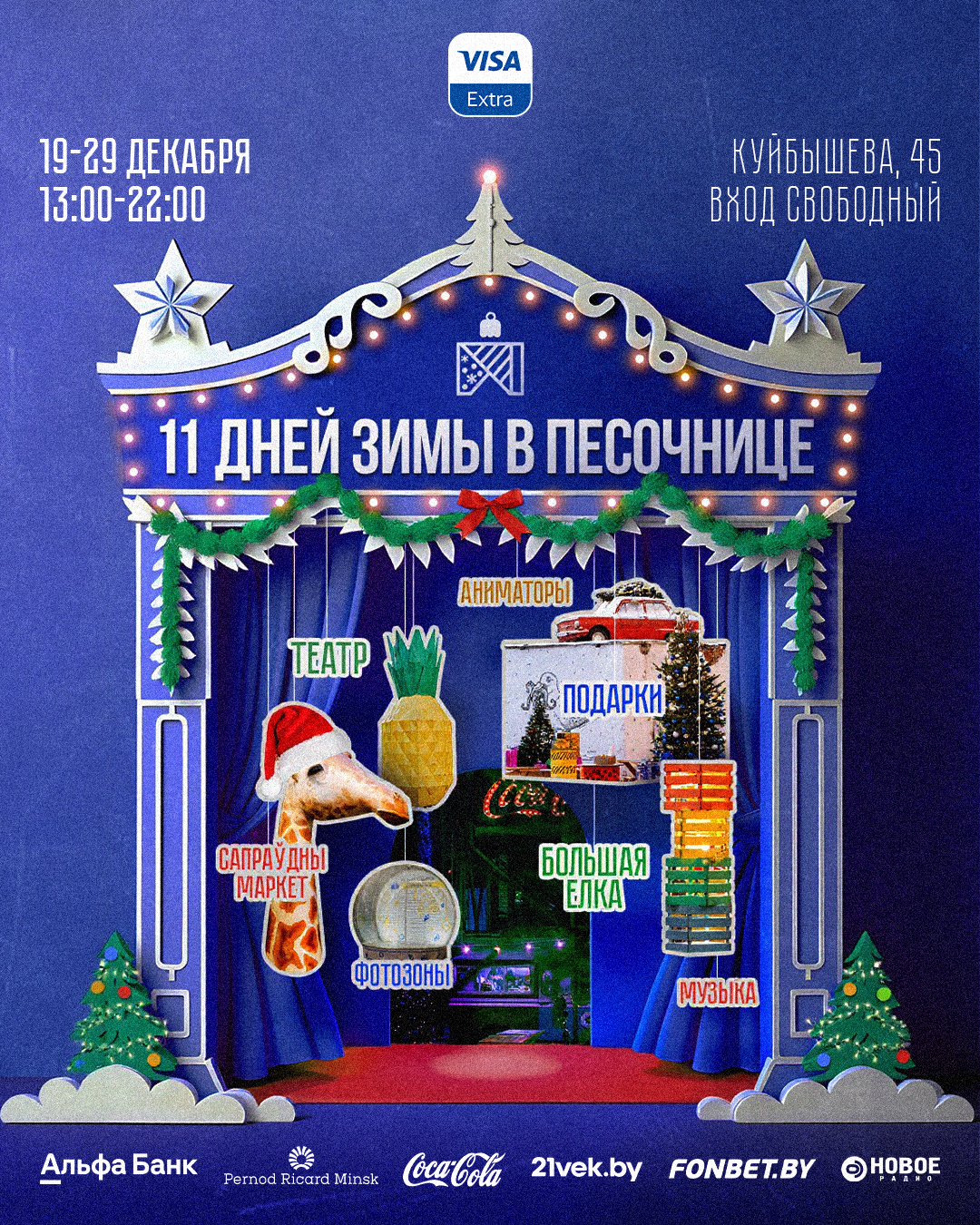 Новогоднее меню от фудтраков, горячие напитки, музыка, кукольный театр, аниматоры, развлекательная программа, розыгрыши, конкурсы и подарки от партнёров, фотозоны и 21, 22, 28 и 29 декабря будет функционировать «Сапраўдны Маркет».