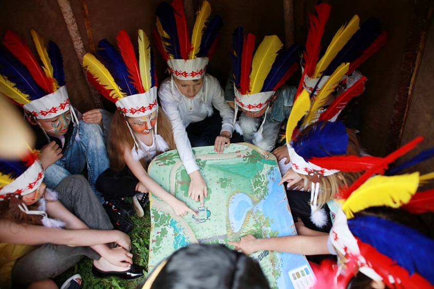 Если праздник в стиле индейцев, то можно отправить детей на поиски тотема, похищенного вражеским племенем. Найти его можно, например, собирая кусочки пазла, которые теряет племя противника.