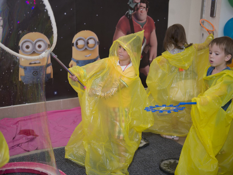 Все развлекательные программы продуманы с учетом возраста детей. Так, с малышами будет играть клоун Ромашка и ее питомцы — кролик и крыска. Маленькие дети поучаствуют в подвижных играх, потанцуют, порезвятся и уйдут с игрушками из воздушных шариков. Есть альтернатива – клоун Клёпик. Он проводит подвижные игры и эстафеты, дискотеку, показывает фокусы и покоряет всех с помощью шоу мыльных пузырей. Ромашка также проводит шоу мыльных пузырей по желанию родителей. Кстати, для участия в шоу всем детям выдается специальная накидка, благодаря которой малыш не намокнет и не выпачкается в пене.