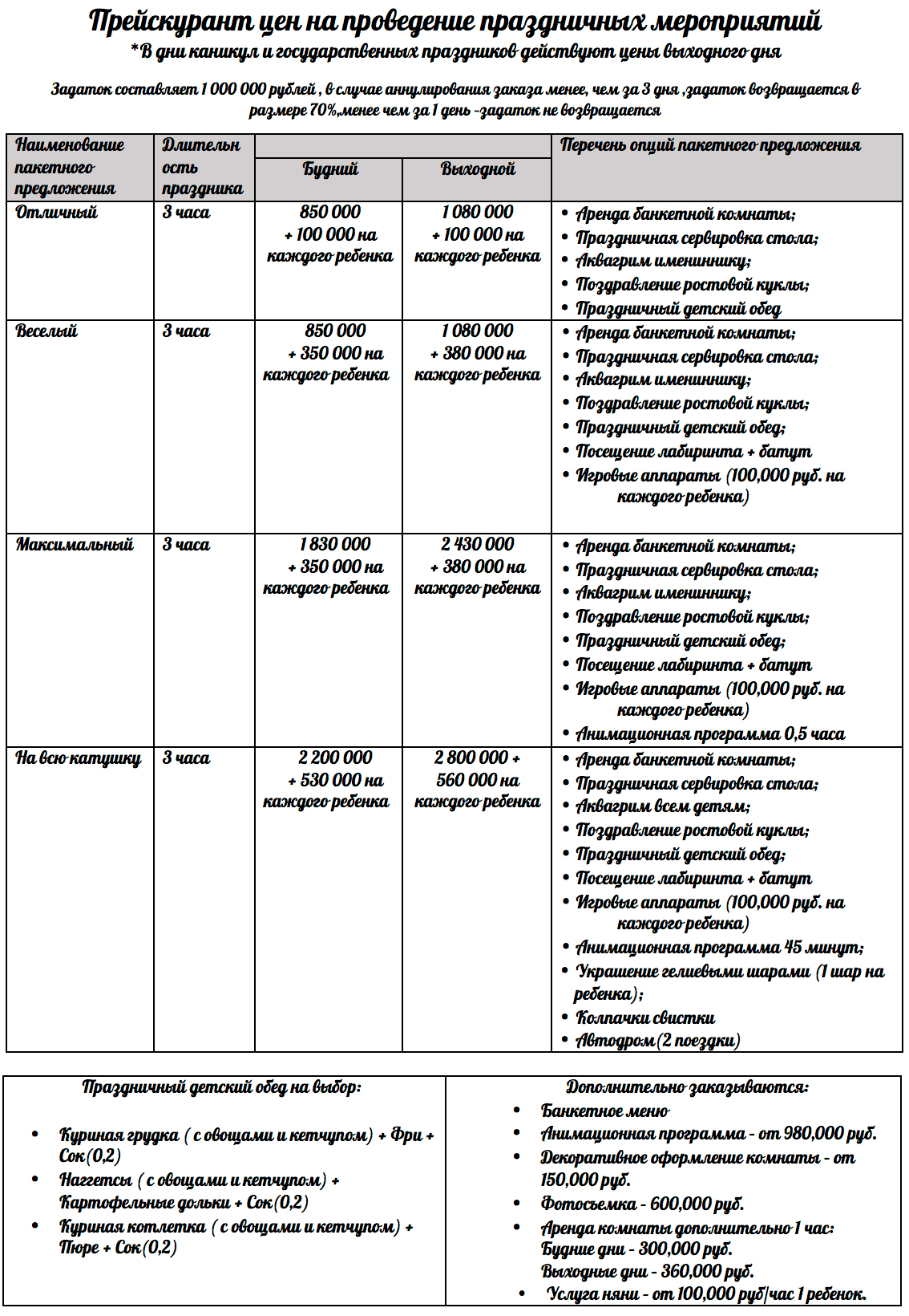 - Мы предлагаем своим клиентам несколько пакетов, — продолжает рассказывать Наталия. — Всего их четыре, и они рассчитаны на 3 часа. Самый минимальный пакет «Отличный» включает аренду и праздничную сервировку банкетного стола, аквагрим имениннику, поздравление ростовой куклы, праздничный детский стол. Остальные три пакета дополнительно предлагают посещение лабиринта и батута, есть варианты с игровыми автоматами и посещением автодрома, анимационной программой, праздничным украшением комнаты гелиевыми шарами. По желанию родителей детский центр «Карамелька» может составить уникальную программу с включением самых разнообразных праздничных услуг.