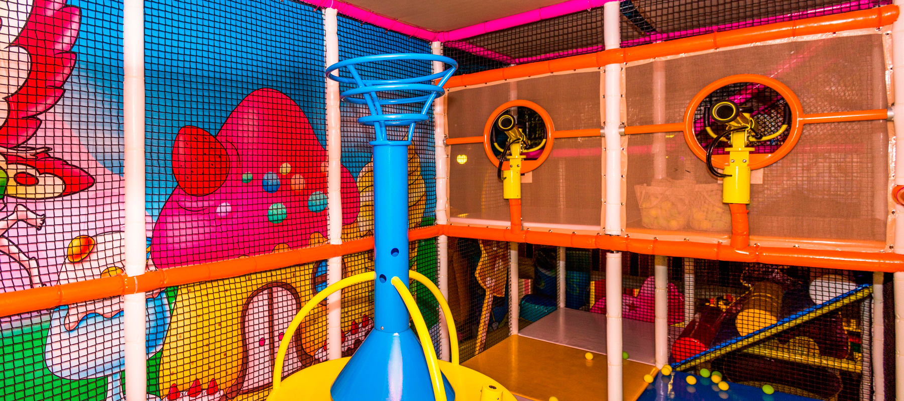 горками, пушками, настоящей тарзанкой, батутами, лабиринтом с перелазами и